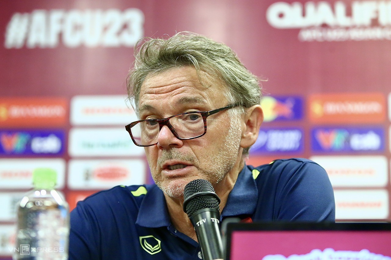 HLV Troussier họp báo sau trận thắng Yemen 1-0 trên sân Việt Trì tối 9/9 ở vòng loại bảng C giải U23 châu Á 2024. Ảnh: Hiếu Lương