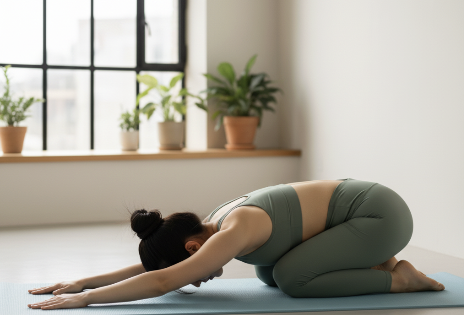 Quỳ gối trên thảm, hai ngón chân cái chạm vào nhau và hai đầu gối mở rộng bằng hông. Mông đặt trên gót chân, gập người về phía trước, duỗi thẳng hai tay ra trước mặt hoặc dọc theo cơ thể. Đặt trán lên thảm và hít thở sâu vào lưng. Giữ tư thế này càng lâu càng tốt.