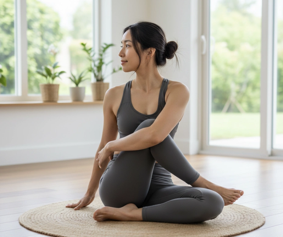 Người tập ngồi xuống, duỗi thẳng chân, thư giãn toàn bộ cơ thể. Gập chân trái, đặt bàn chân trái gần mông phải. Bắt chéo bàn chân phải qua và đặt xuống cạnh đùi trái. Xoay thân sang phải, đặt khuỷu tay trái lên phía ngoài đầu gối phải. Giữ tư thế trong khi hít vào để kéo dài cột sống và thở ra để xoắn sâu hơn. Lặp lại ở phía bên kia.