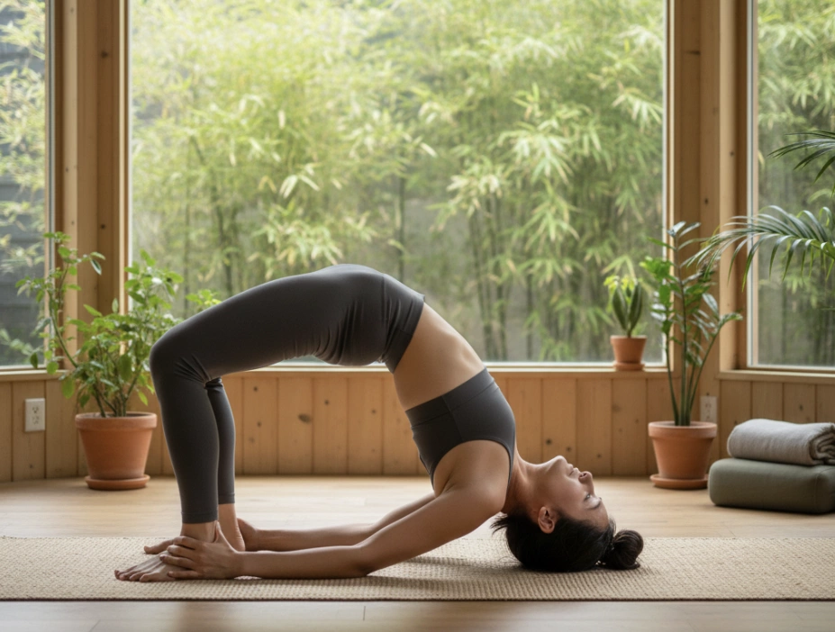Bạn nằm ngửa trên thảm, co đầu gối, bàn chân cách nhau một khoảng rộng bằng hông, gót chân gần chạm hông. Hít vào, từ từ nâng hông lên phía trần nhà, ấn bàn chân và cánh tay xuống thảm. Ôm chặt hai tay dưới lưng và xoay vai xuống, mở rộng ngực. Giữ tư thế trong vài nhịp thở trước khi thả lỏng.