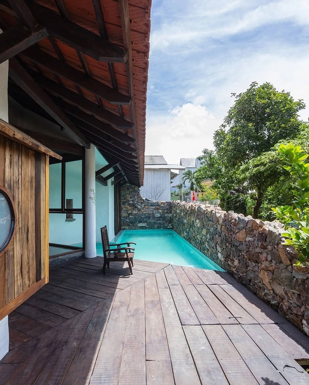 Hachi Homestay nằm trên đường Thân Văn Nhiếp, làng Thủy Biều, cách trung tâm thành phố khoảng 6 km, mang đến không gian nghỉ dưỡng yên tĩnh, gần gũi thiên nhiên. Homestay có kiến trúc biệt thự vườn hai tầng hình chữ U, bao quanh hồ bơi và vườn bưởi xanh mát. Ảnh: Quỳnh Mai