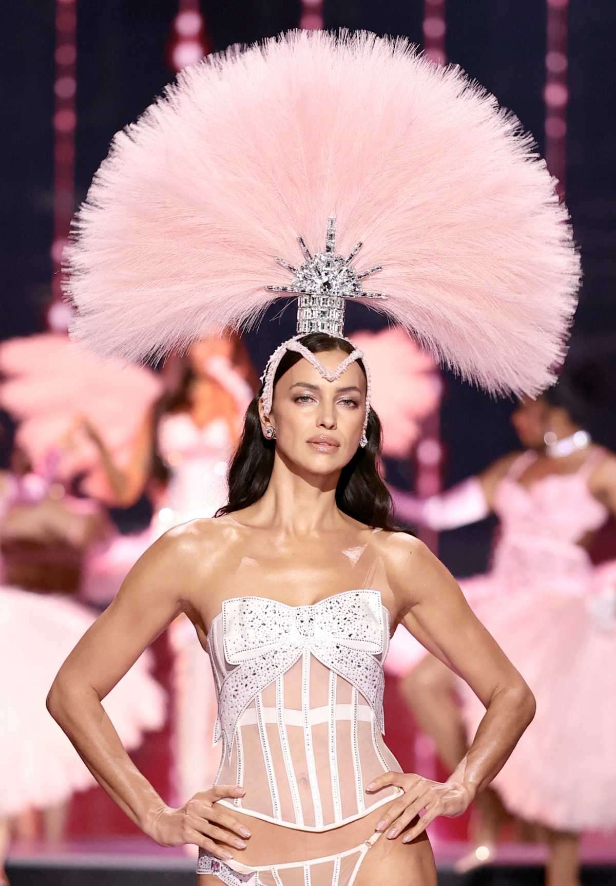 Siêu mẫu Irina Shayk trong bộ corset hình nơ 3D, đội mũ lông vũ. Màn trình diễn của cô gợi nhớ đến những vũ nữ thoát y thập niên cũ.