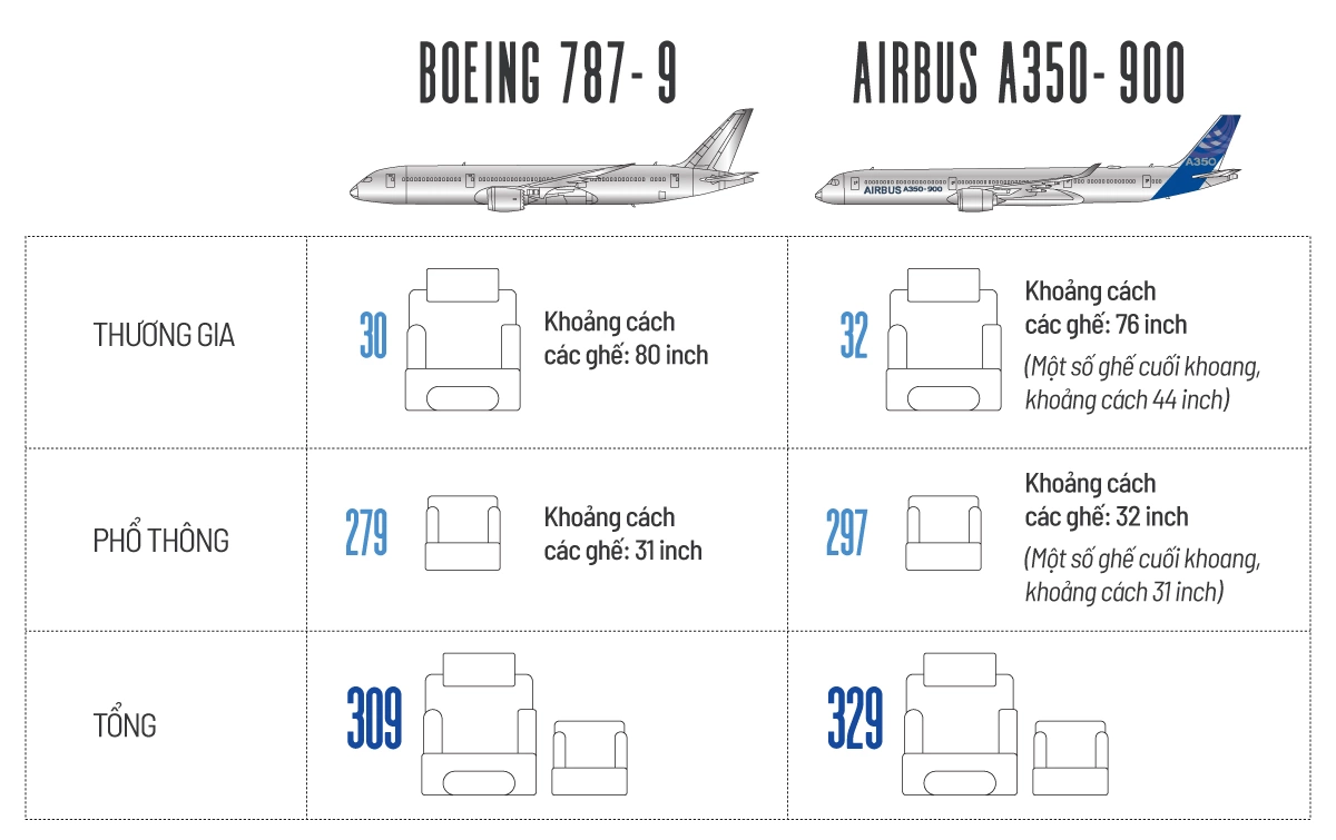 Ở cấu hình trên, cả 787-9 và A350-900 đều được chia 9,7% số ghế cho khoang Thương gia và 90,3% cho khoang Phổ thông. Nếu bổ sung một hạng ghế