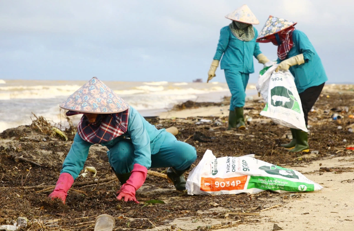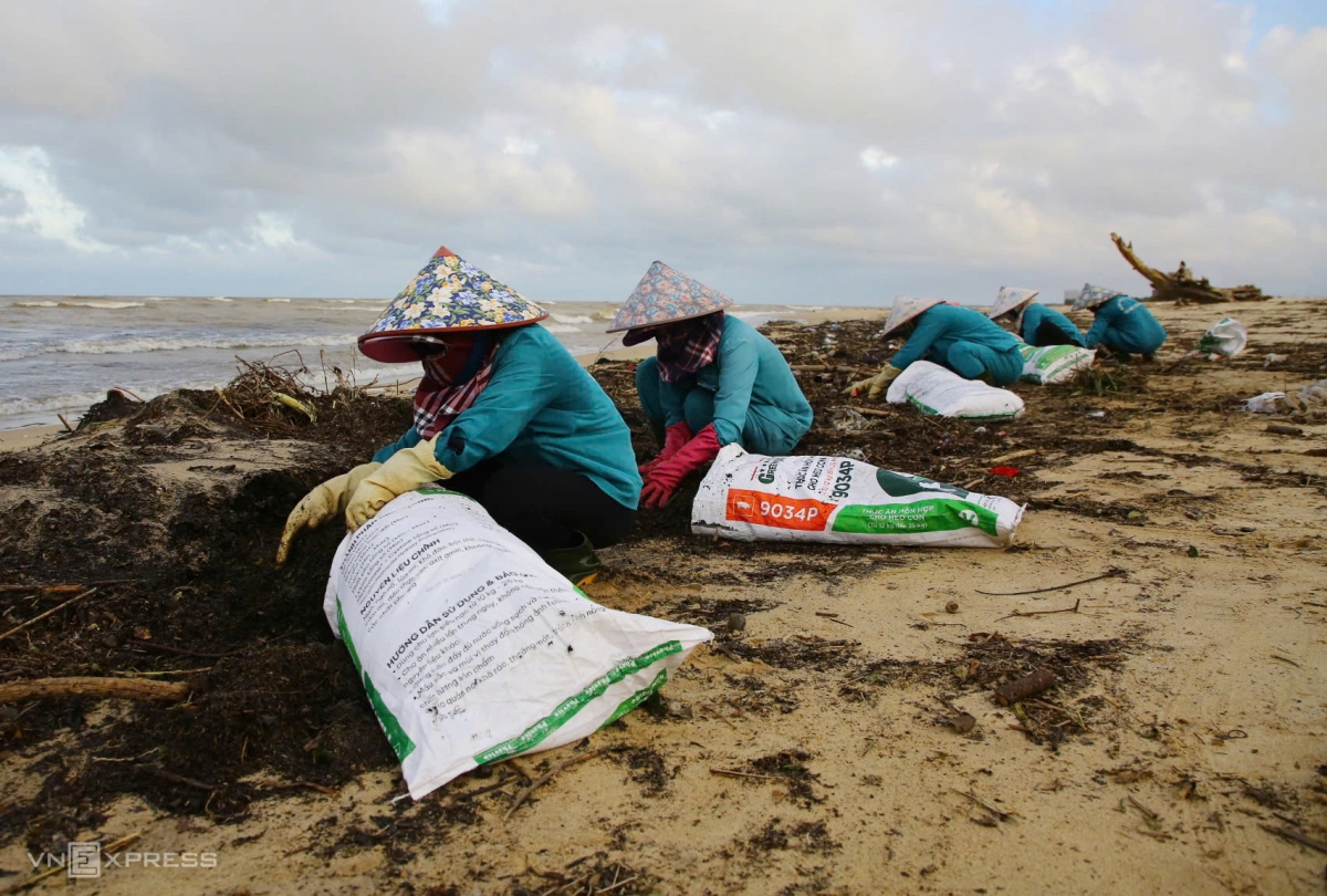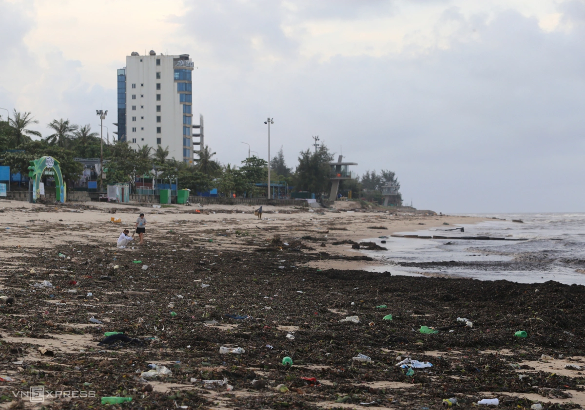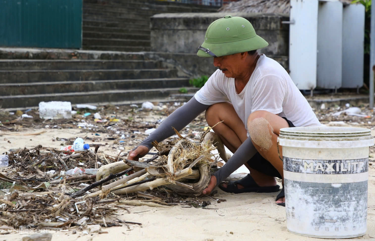 Ông Trần Văn Tân, chủ cơ sở dịch vụ ven biển, cho biết rác tấp dày đặc sau bão. Gia đình ông ba ngày nay dọn từ sáng đến tối mà vẫn không xuể. "Dọn hôm nay xong thì tối rác lại tấp vào, nhưng để bán hàng thì phải dọn sạch", ông giải thích.