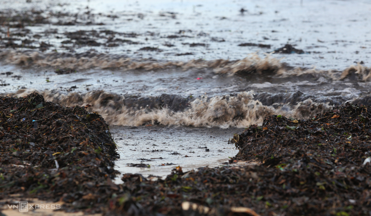 Khác với màu xanh trong trước đây, nước biển Nhật Lệ những ngày qua chuyển vàng đục, nhiều đoạn đen đặc do rác phân hủy và sóng đánh tan.
