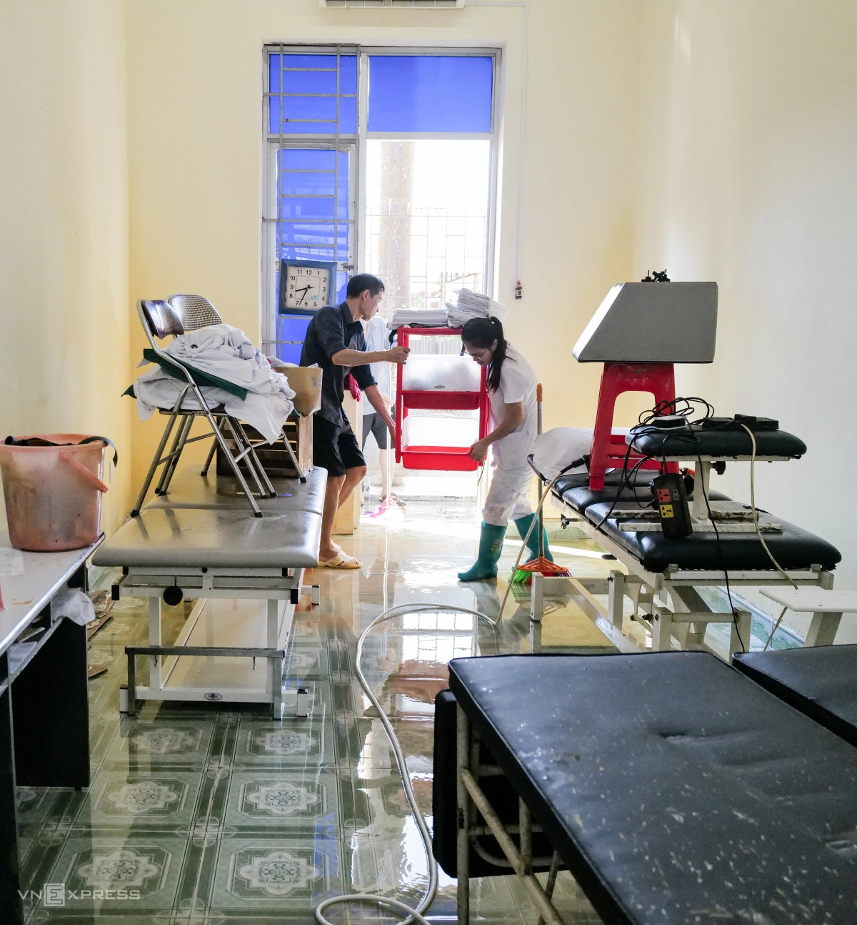 Việc dọn dẹp chủ yếu là lực lượng tại chỗ, nhân viên bệnh viện. Tại một số phòng khám ở tầng một, nhân viên dòng dây dẫn nước vào rửa sạch bùn, kê lại đồ đạc, sau đó sẽ khử khuẩn toàn bộ.