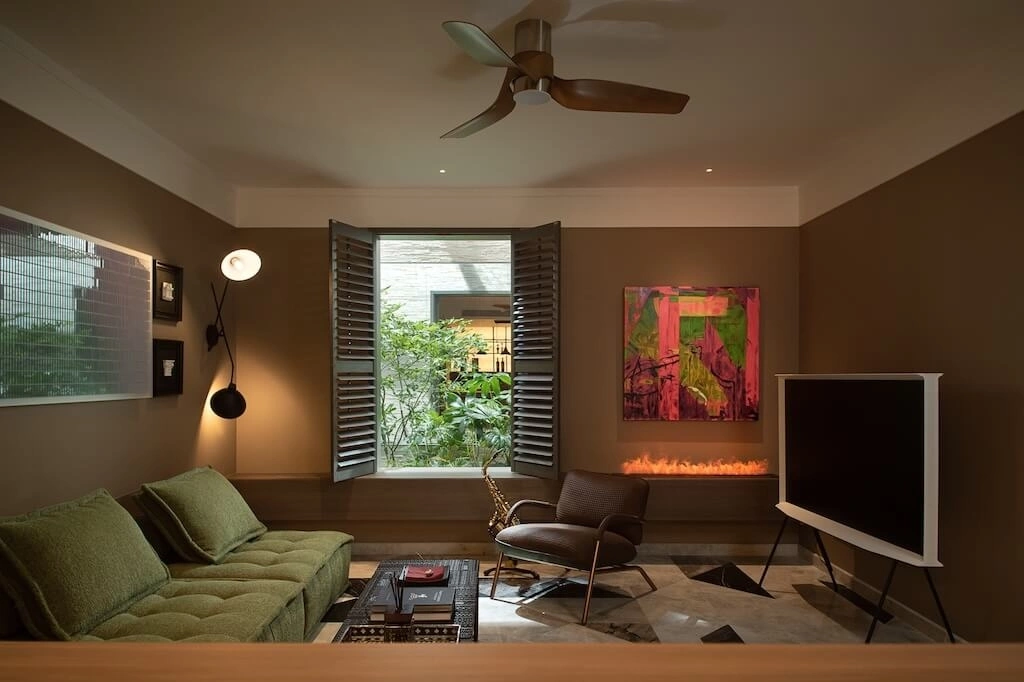 Không gian sinh hoạt chung có tông màu đậm hơn với sàn lát đá cẩm thạch hình học. Những món nội thất như ghế sofa nhung xanh olive, ghế da khung đồng, tranh tường màu sắc mạnh, quạt trần gỗ... tất cả gợi cảm giác của một quán bar nhỏ kết hợp phòng trưng bày nghệ thuật.