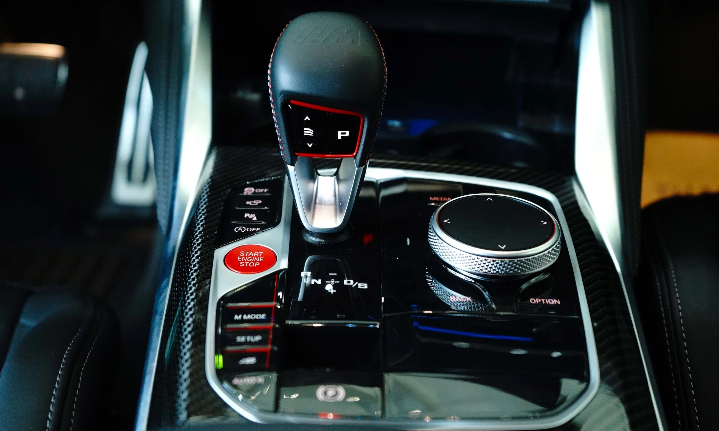 Vô-lăng bọc da, ốp carbon trên M4 Competition. Ngoài hai lẫy chuyển số sau vô-lăng bằng sợi carbon, xe có thêm hai nút đỏ M1, M2 với chức năng nhớ cấu hình độ nhạy của chân ga, động cơ, hệ thống treo hay chế độ lái do người dùng thiết lập.