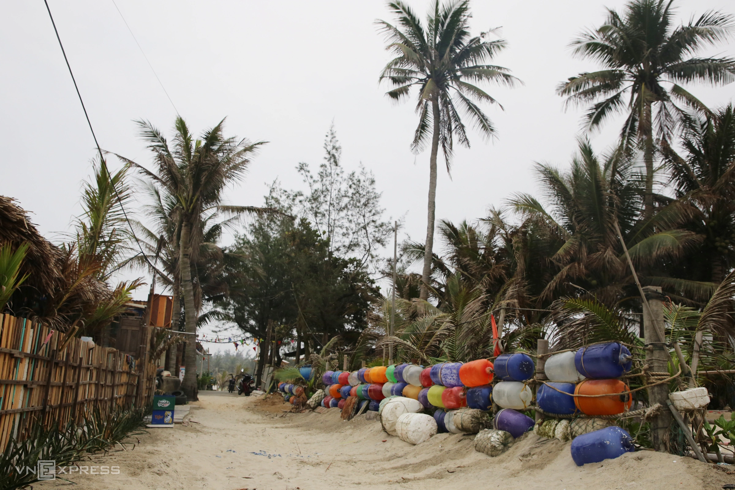 Ông Nguyễn Châu, 60 tuổi, khối phố Thịnh Mỹ, phường Cẩm An đang dọn bàn ghế phục vụ du khách. Ông cho biết từ năm 2021 sạt lở bắt đầu xuất hiện, đến 2023 bị xói lở 50 m, cuốn một ngôi nhà. Năm 2024, dự án xây kè ngầm chắn sóng và đổ cát tạo bãi, trả lại gần như nguyên vẹn. "Hiện sóng đánh vào có đê ngầm ngăn lại, nước không xoáy vào bờ cuốn đất, cát ra khơi", ông nói.