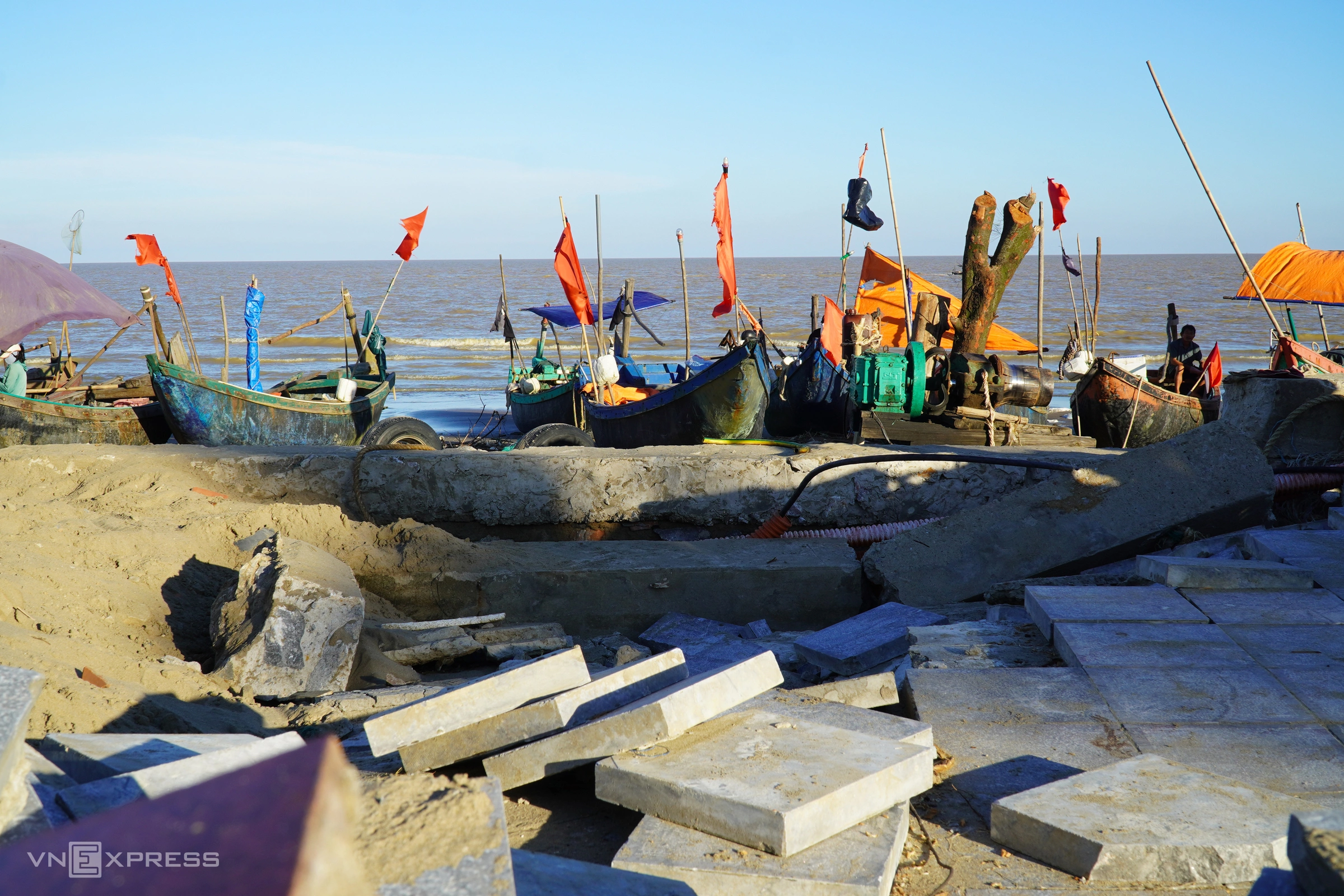 Thuyền đánh cá của ngư dân phường Sầm Sơn bị sóng phá hỏng, trôi dạt vào bờ, sáng 4/10.