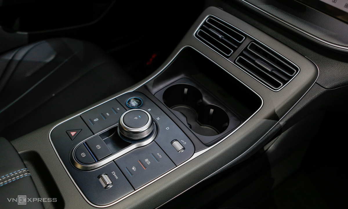 Cần số dạng núm xoay. Xe có sạc không dây 15W. Nút bấm lựa chọn chế độ vận hành EV hay HEV. Cần gạt chế độ lái Eco/Normal/Sport.
