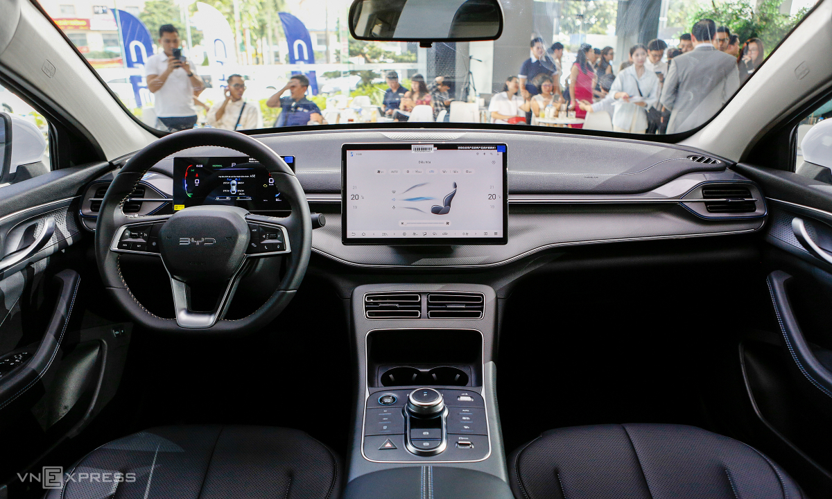Sau vô-lăng là màn hình kỹ thuật số 8,8 inch, hiển thị đầy đủ thông tin xe. Xe có hệ thống khóa thông minh, khởi động nút bấm, quản lý xe qua ứng dụng BYD Apps.