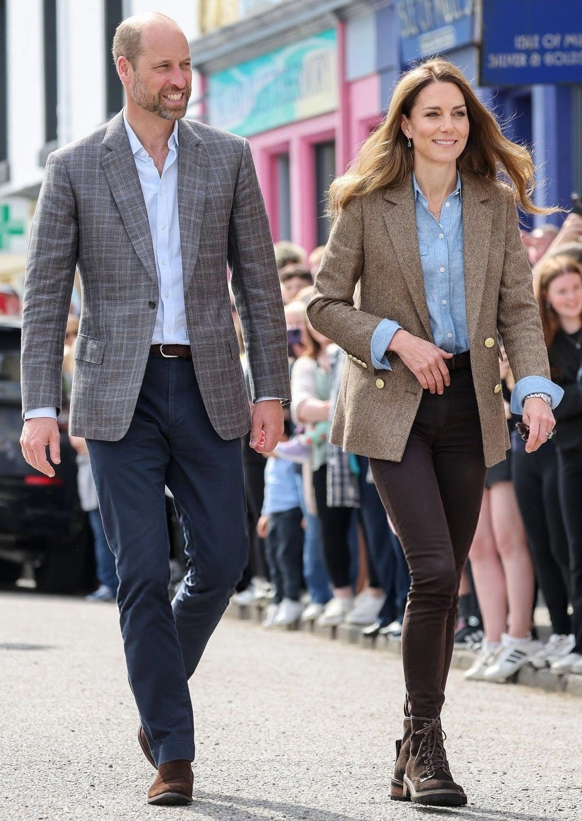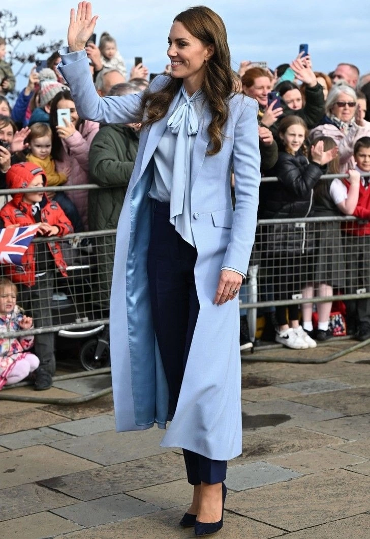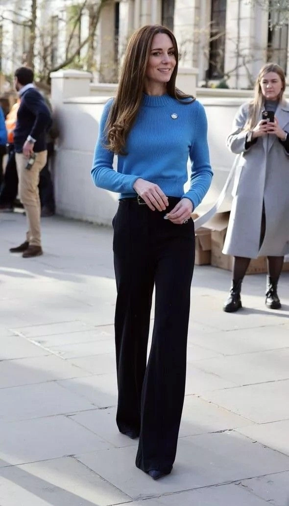 Vương phi tôn chiều cao nhờ kết hợp quần nhung ống suông cạp cao và áo len mỏng dáng ngắn. Cô không bao giờ mặc đồ rộng hay oversized như Công nương Diana, thay vào đó là những thiết kế vừa vặn cơ thể, giúp tổng thể gọn gàng. Ảnh: Pinterest