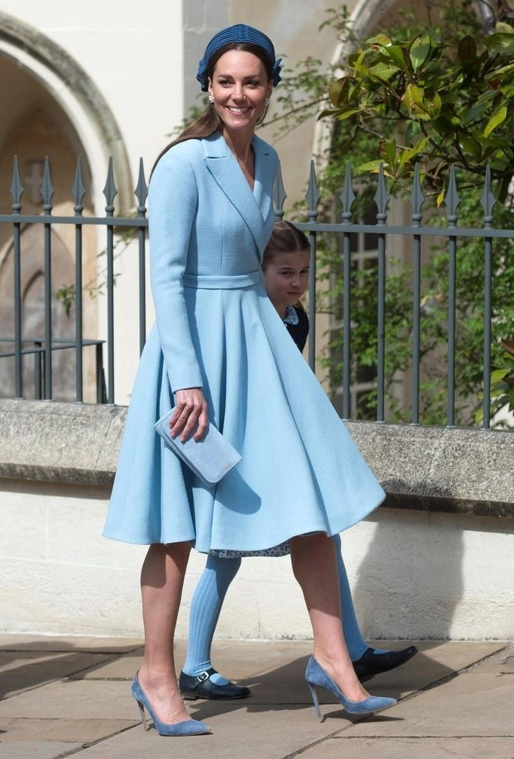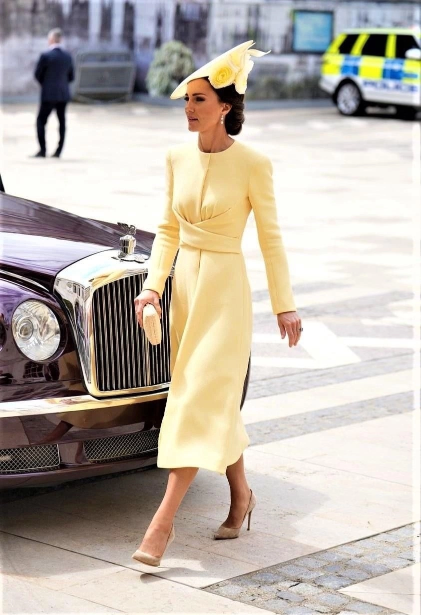 Ở một sự kiện khác, cô chọn đầm vàng tươi ăn ý mũ kiểu cách. Vương phi Kate Middleton mang giày gót nhọn da lộn quanh năm, dù đây là thiết kế đặc trưng của mùa Thu Đông. Cô sắm nhiều đôi giống nhau chỉ khác màu để tiện phối, như nude, champagne, xanh dương đậm. Ảnh: HC