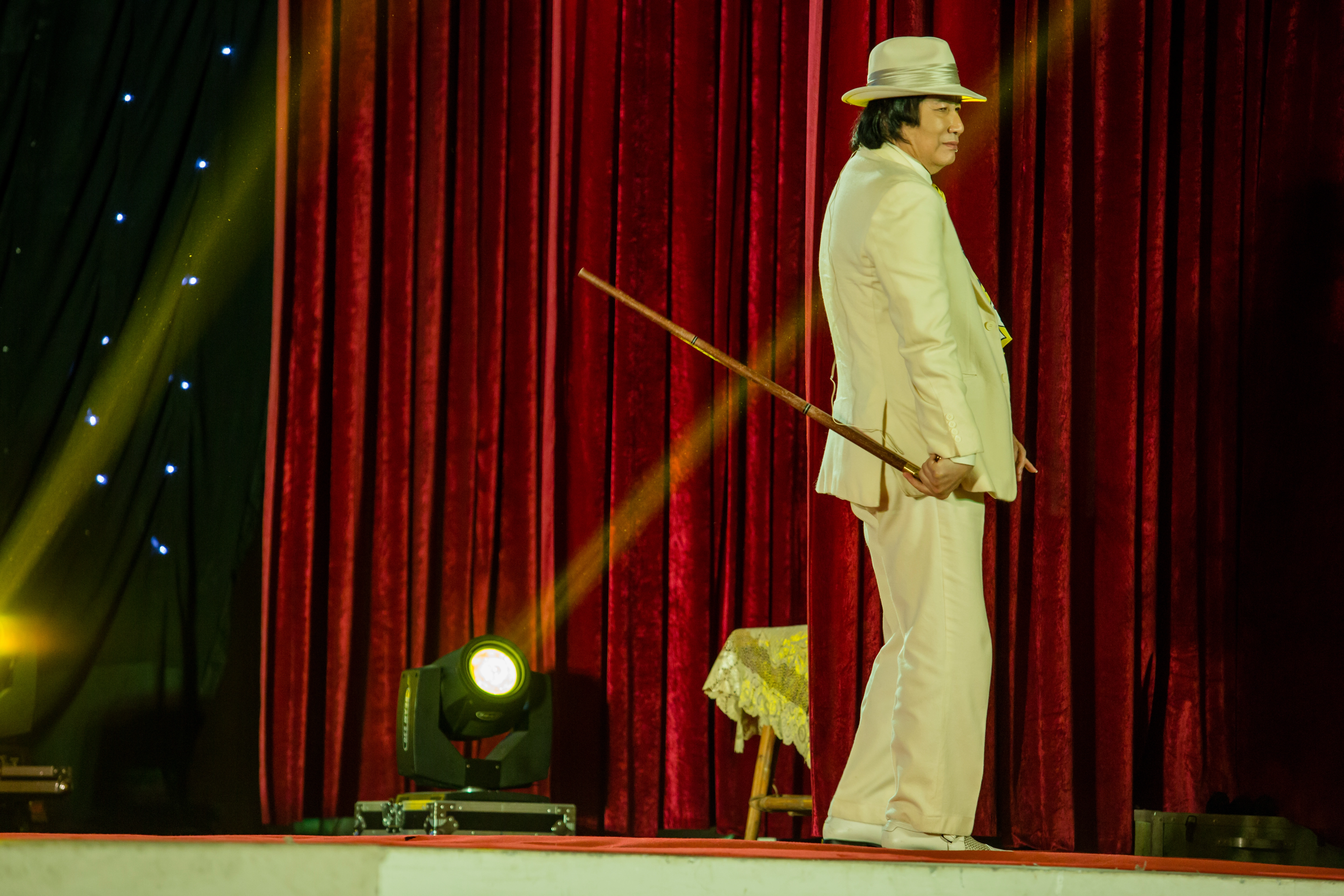 Thời kỳ đầu, chưa có điện, sân khấu được treo bốn cái đèn măng xông đốt dầu lớn ở bốn góc. Người làm ánh sáng dán giấy màu vào cái thùng bên trong có cây đèn chiếu. Ông họa lên tấm kiếng trước đèn những nét bút như làn nước, cái đèn khác được ông vẽ các đám mây. Khi chiếu lên phông cùng lúc, sẽ hiện ra đám mây và làn nước rung rinh trên "dòng sông", nơi đào chính và kép chính đang tâm tình.