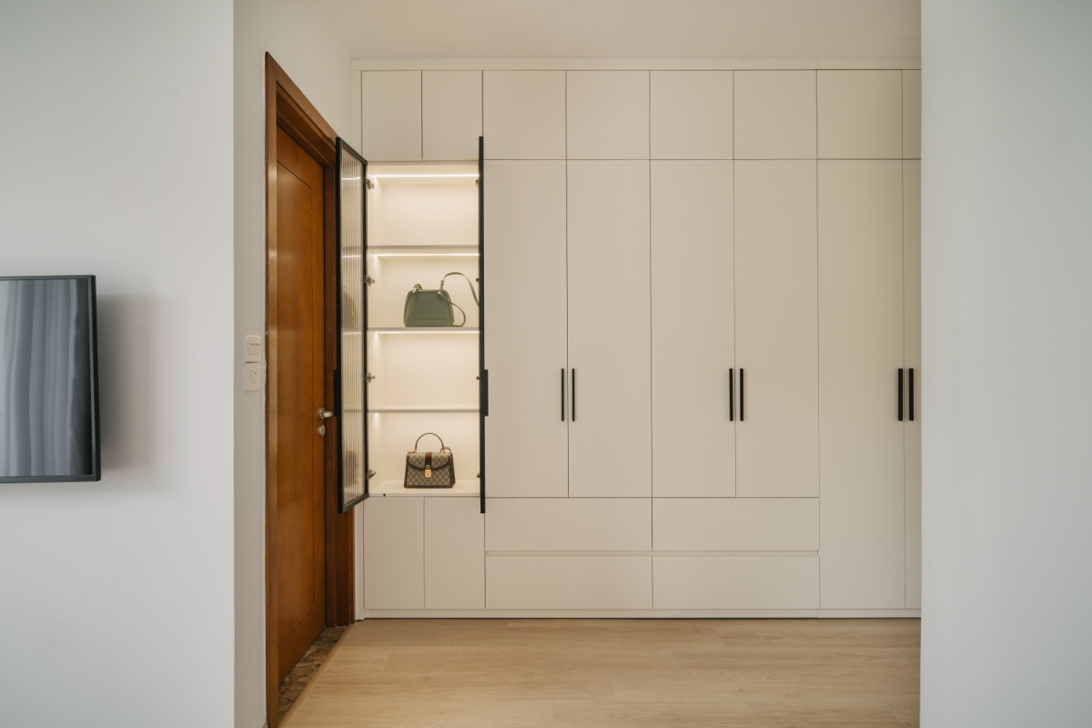 Tủ âm tường kịch trần tích hợp kệ trưng bày có đèn LED âm, tối ưu lưu trữ mà vẫn đảm bảo yếu tố thẩm mỹ cho không gian phòng ngủ.