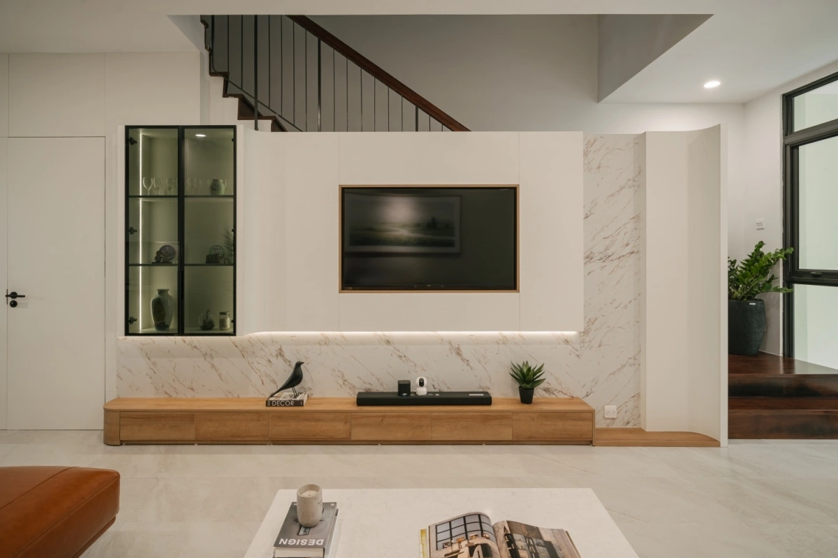 Nhà vệ sinh tầng một xử lý lại phần vách để giấu hệ kệ âm, hốc treo tivi, giúp không gian sinh hoạt liền mạch.