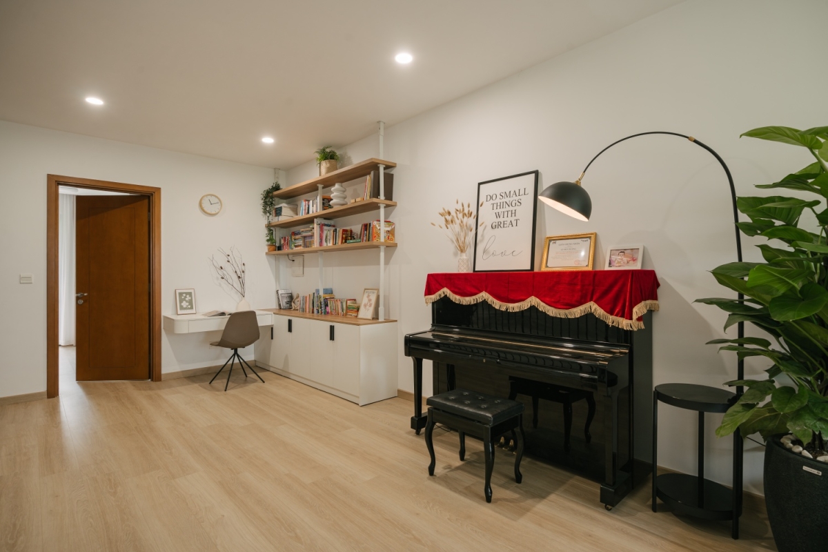 Tầng hai là không gian sinh hoạt chung, nơi cả nhà có thể đọc sách, chơi đàn, trò chuyện hằng ngày. Nội thất sử dụng chất liệu gỗ sồi tự nhiên, phối với tông trắng, be.