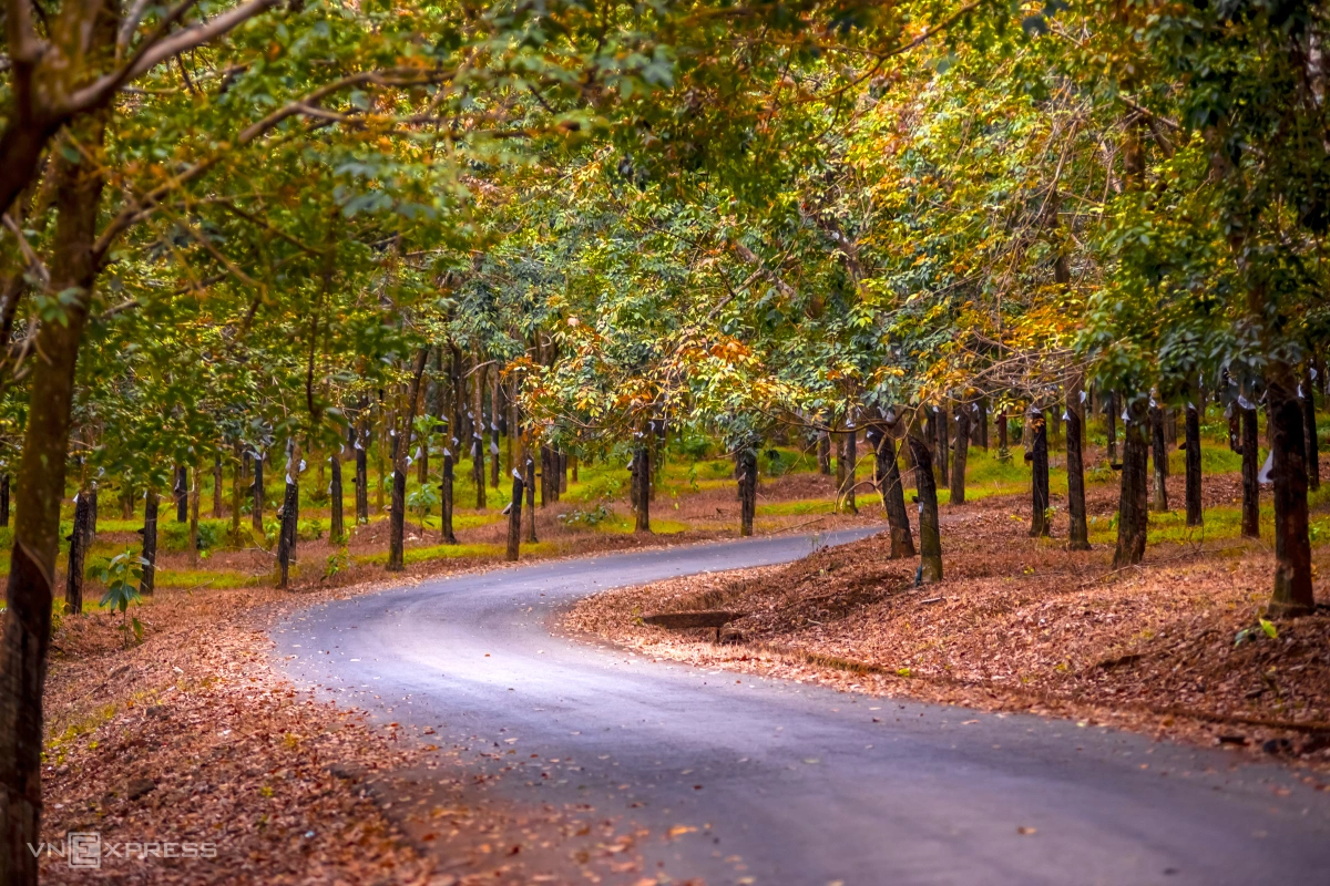 Bình Phước được mệnh danh là thủ phủ cao su nên du khách có thể bắt gặp rừng cao su ở khắp nơi. Cây cao su được trồng xen lẫn giữa các rừng cây non và già tạo nên một dải đất rộng bạt ngàn như một bức tranh sơn dầu với đủ các gam màu từ xanh non, xanh thẫm đến vàng. Vào khoảng cuối năm, du khách có thể đến đây tổ chức picnic, ngồi trên những thảm lá khô dày, êm, ngắm lá vàng rơi và chụp những bức ảnh đẹp.