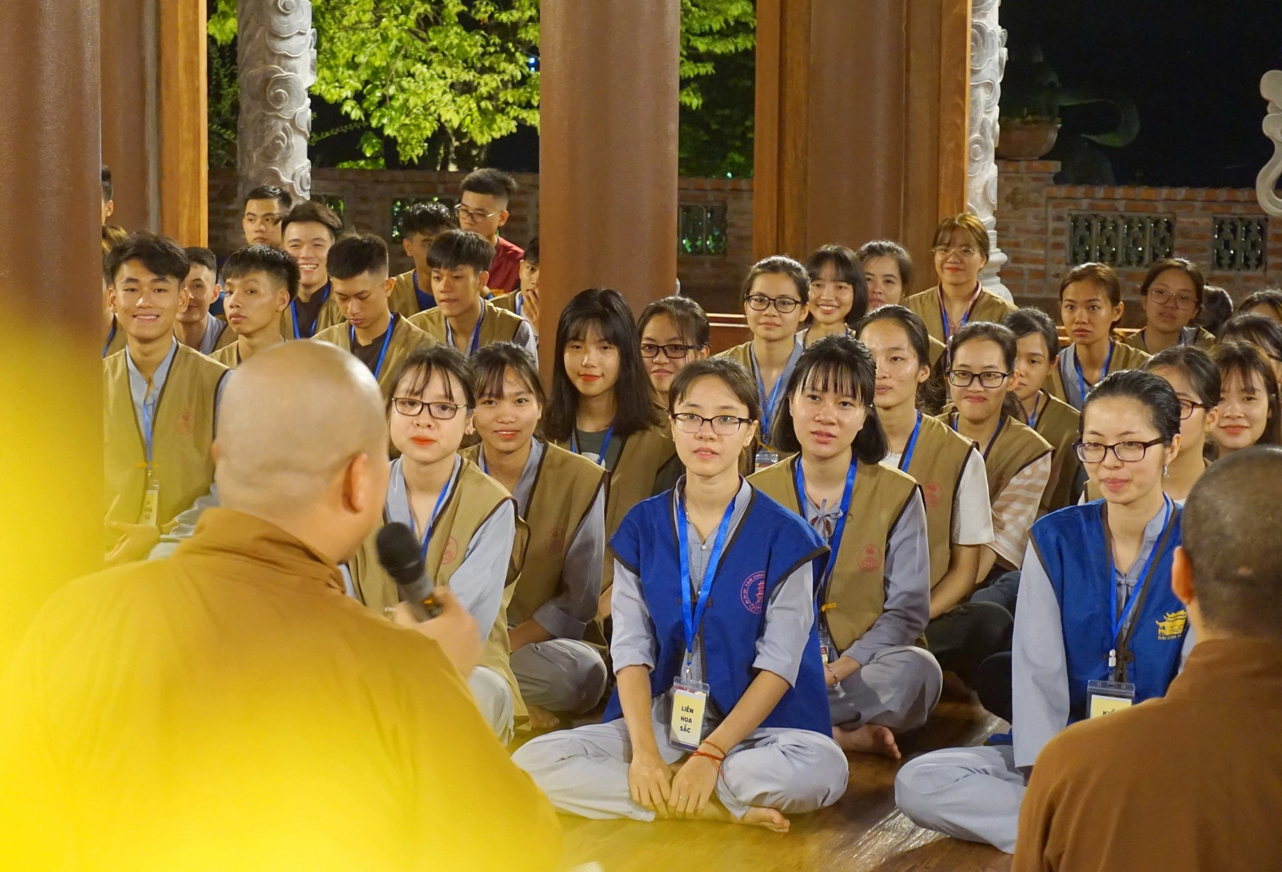 Khi gặp quý sư thầy, sư cô, nên chắp tay hình búp sen ngang ngực và cúi chào hoặc gặp các bạn đồng tu khác hãy mỉm cười.