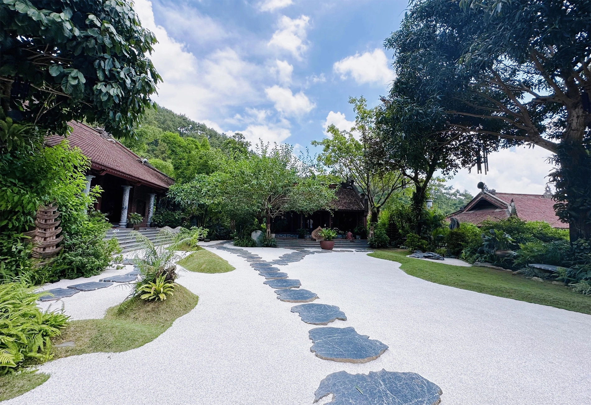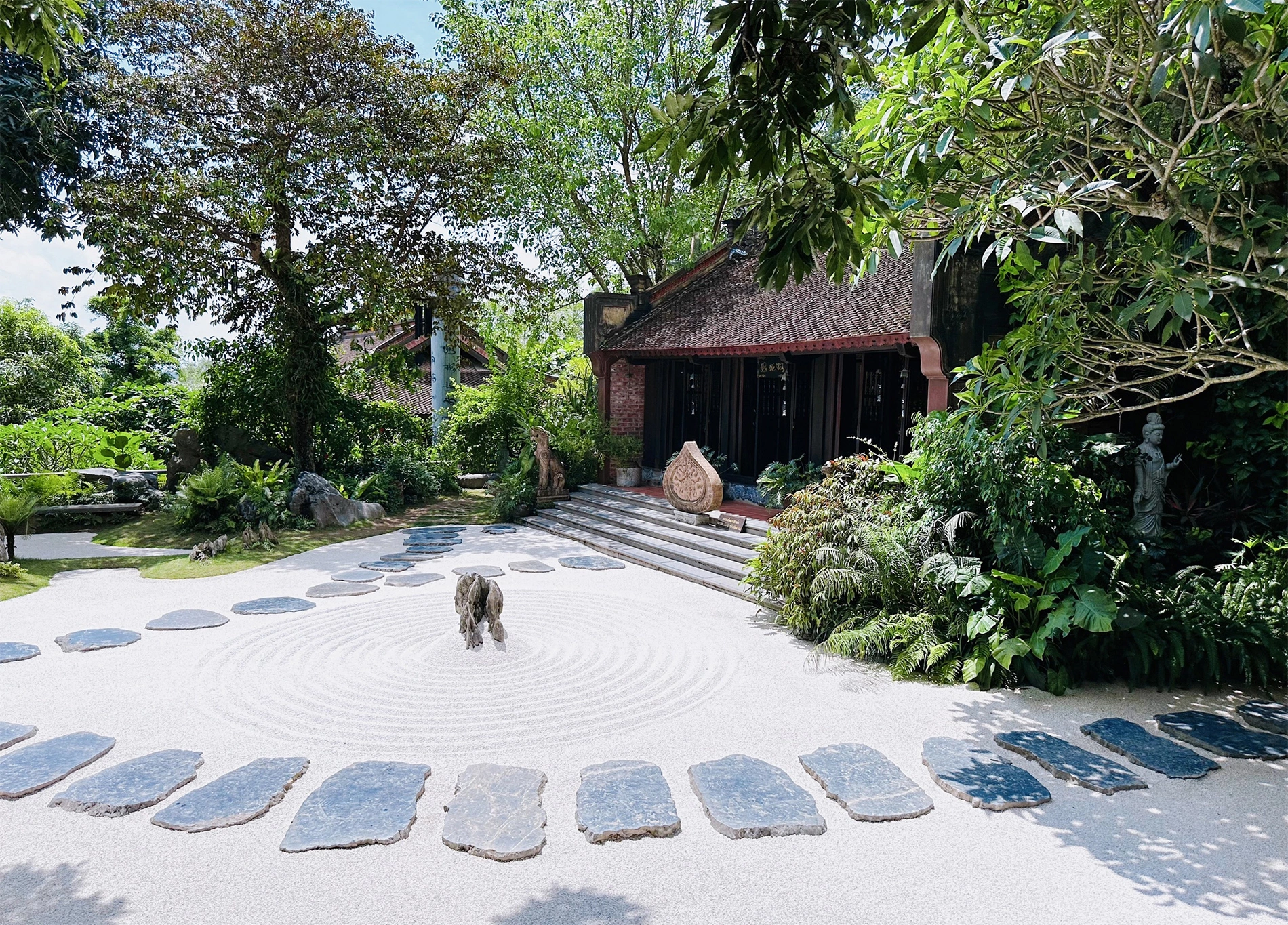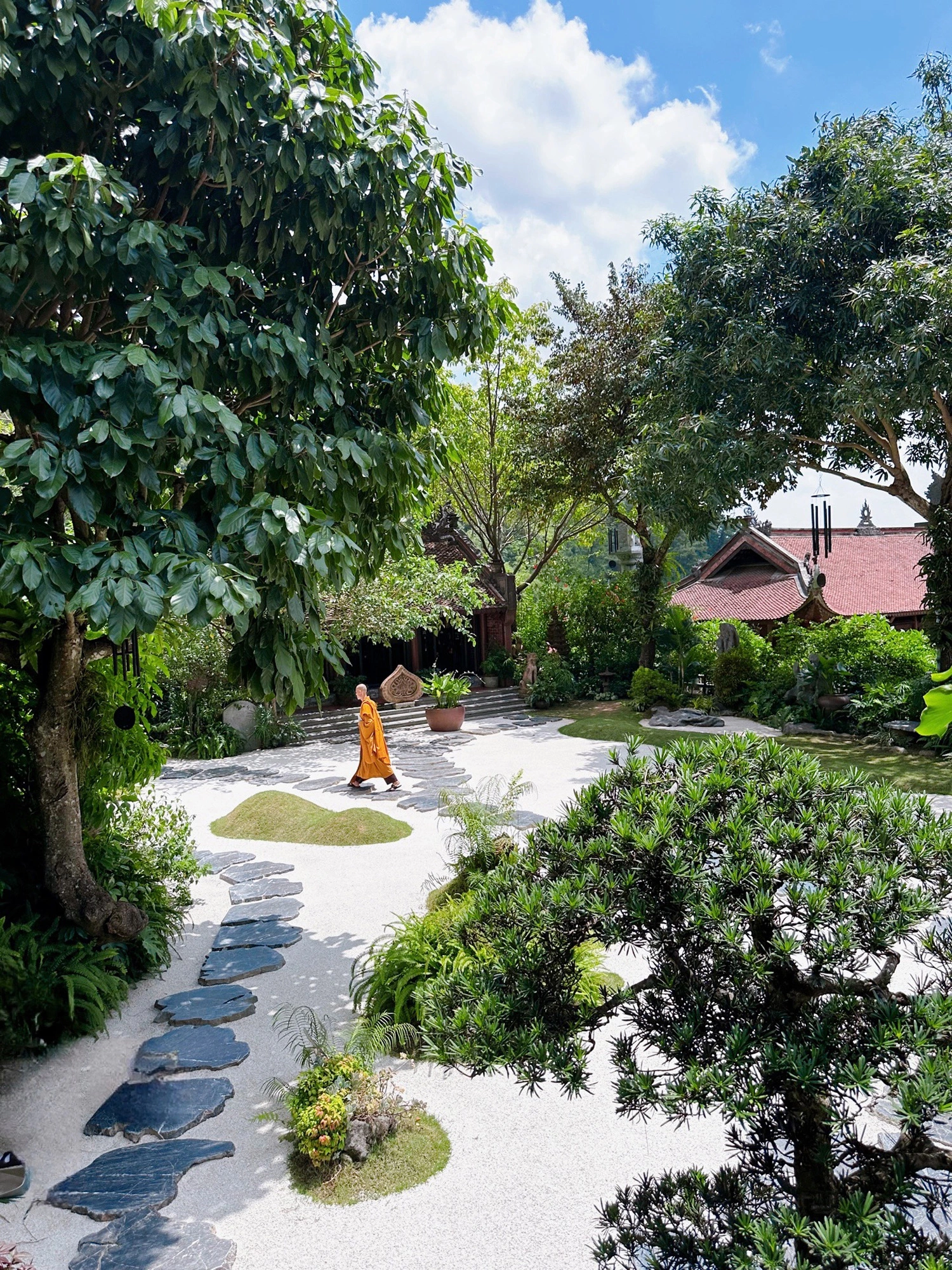 Đường vào chùa trải sỏi trắng thay vì lát gạch đỏ, với 12 vòng tròn tượng trưng cho 12 nhân duyên của con người theo triết lý Phật giáo. Du khách được khuyến khích bước trên những phiến đá để giữ sự trang nghiêm.