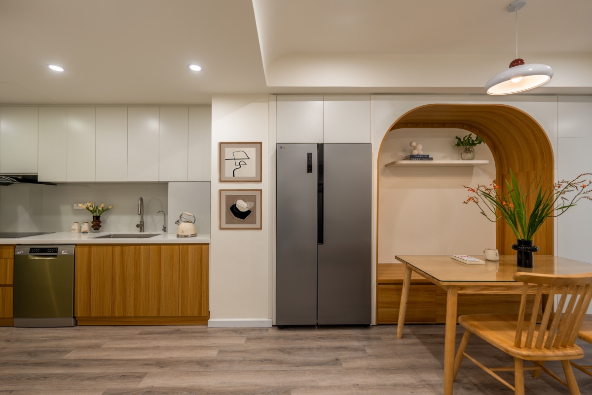 Bàn ăn kết hợp tủ lưu trữ liền khối, đặt dưới vòm gỗ tạo điểm nhấn thị giác.
