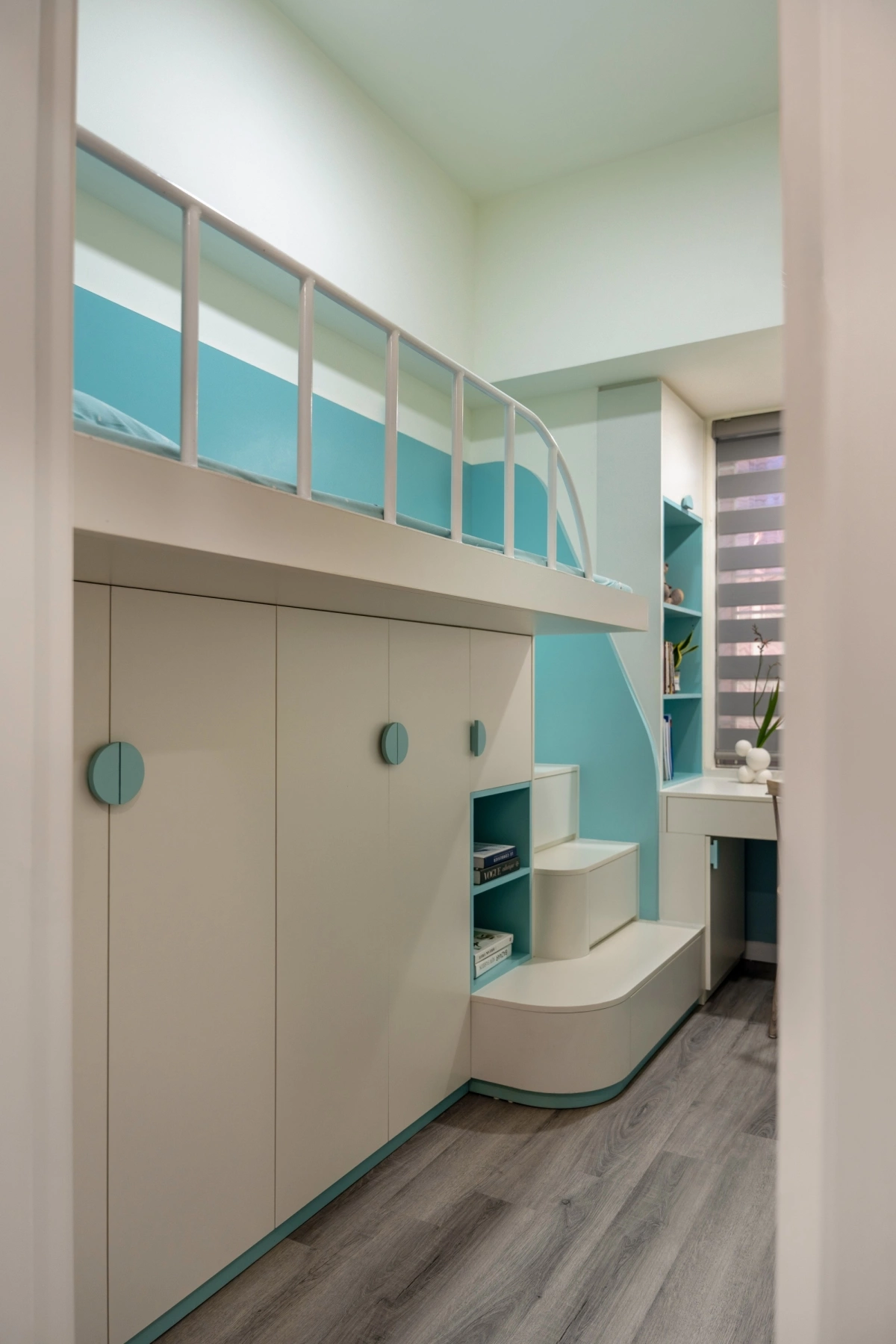 Phòng ngủ cũ được chia đôi để tạo hai không gian nhỏ cho bé trai và gái. Diện tích giới hạn nhưng vẫn đảm bảo mỗi trẻ có không gian riêng tư. Phòng bé trai thiết kế giường tầng kết hợp tủ đồ và giá sách, sử dụng gam xanh nhạt để tạo cảm giác mát mắt, tối ưu chiều cao trần nhà.