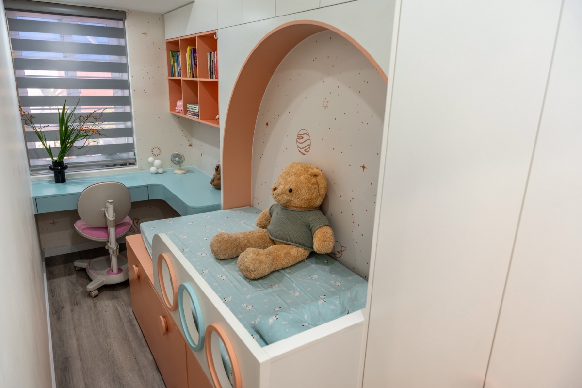 Phòng bé gái sử dụng bảng màu pastel, tích hợp giường, bàn học và kệ sách trong không gian nhỏ, tạo góc sinh hoạt riêng.