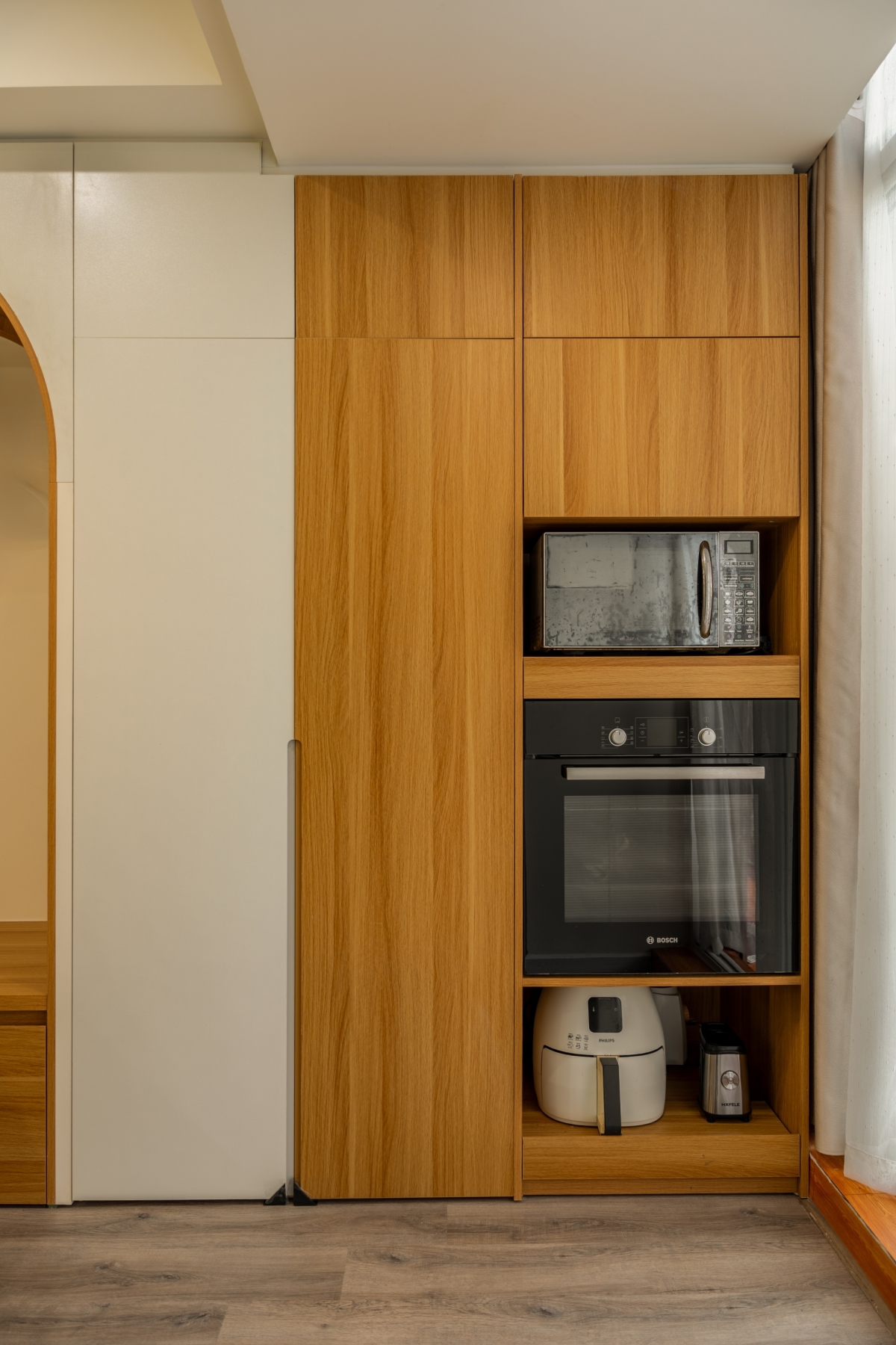 Hệ tủ âm cao sát trần tích hợp lò nướng, lò vi sóng và các thiết bị gia dụng giúp tối ưu diện tích, giữ không gian gọn gàng, liền mạch.