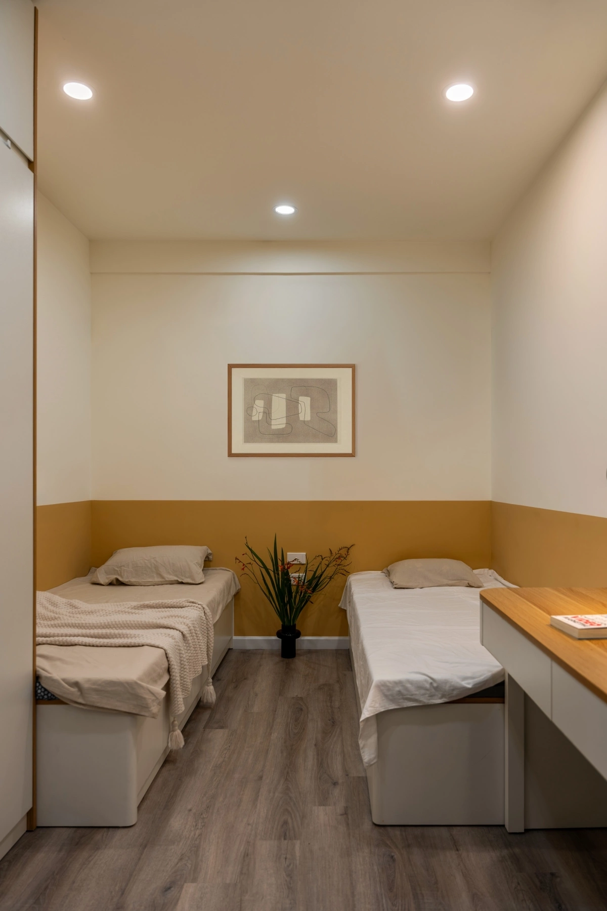 Phòng ngủ ông bà được bố trí hai giường đơn tách biệt, tông màu nâu nhạt tạo cảm giác ấm cúng và dễ chịu cho người lớn tuổi.