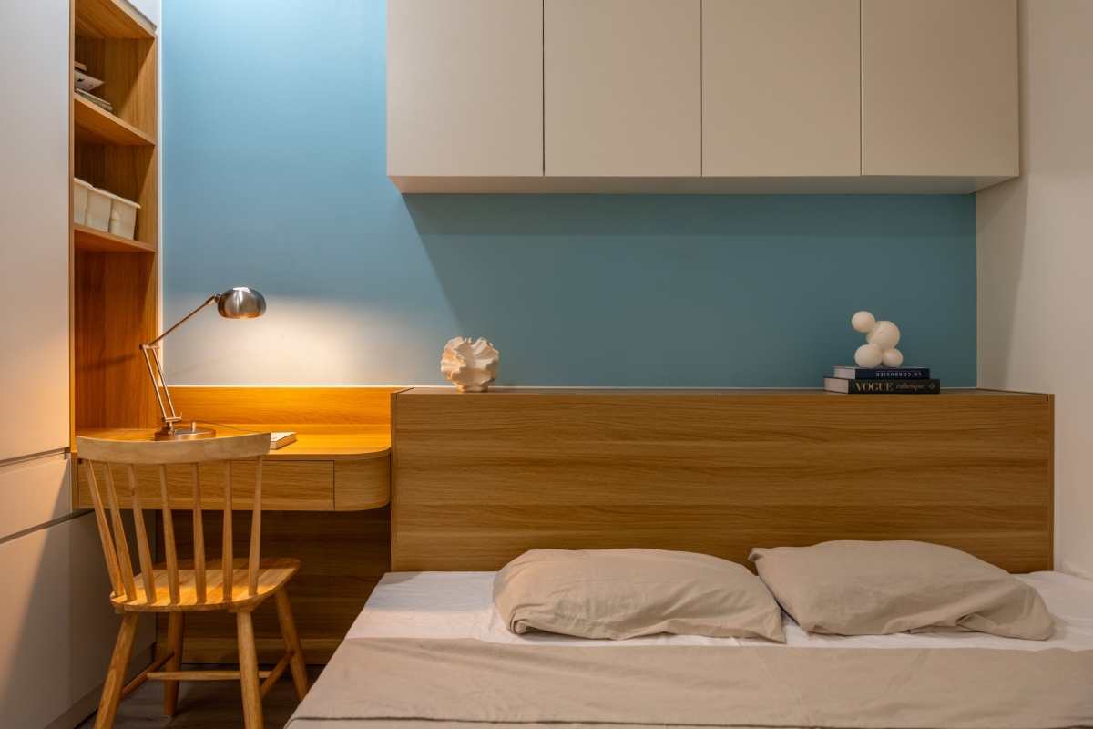 Phòng ngủ vợ chồng sử dụng tông gỗ sáng kết hợp mảng tường xanh dương, bố trí liền kề bàn làm việc để tối ưu diện tích và công năng.