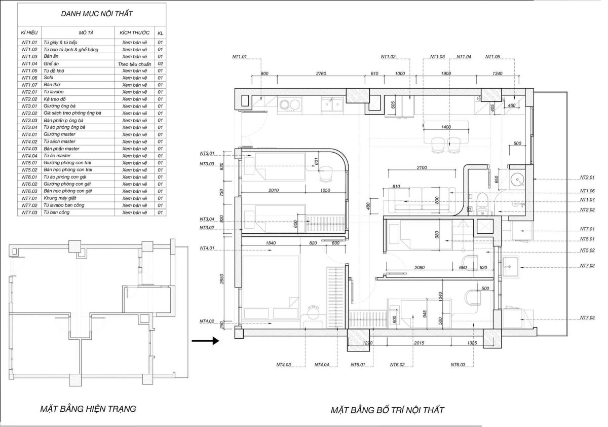 Trước khi cải tạo, căn hộ chỉ có 2 phòng ngủ và 1 vệ sinh. Bản thiết kế mặt bằng nội thất sau cải tạo đã có sự phân chia lại toàn bộ không gian từ 2 phòng thành 4 phòng chức năng riêng biệt.