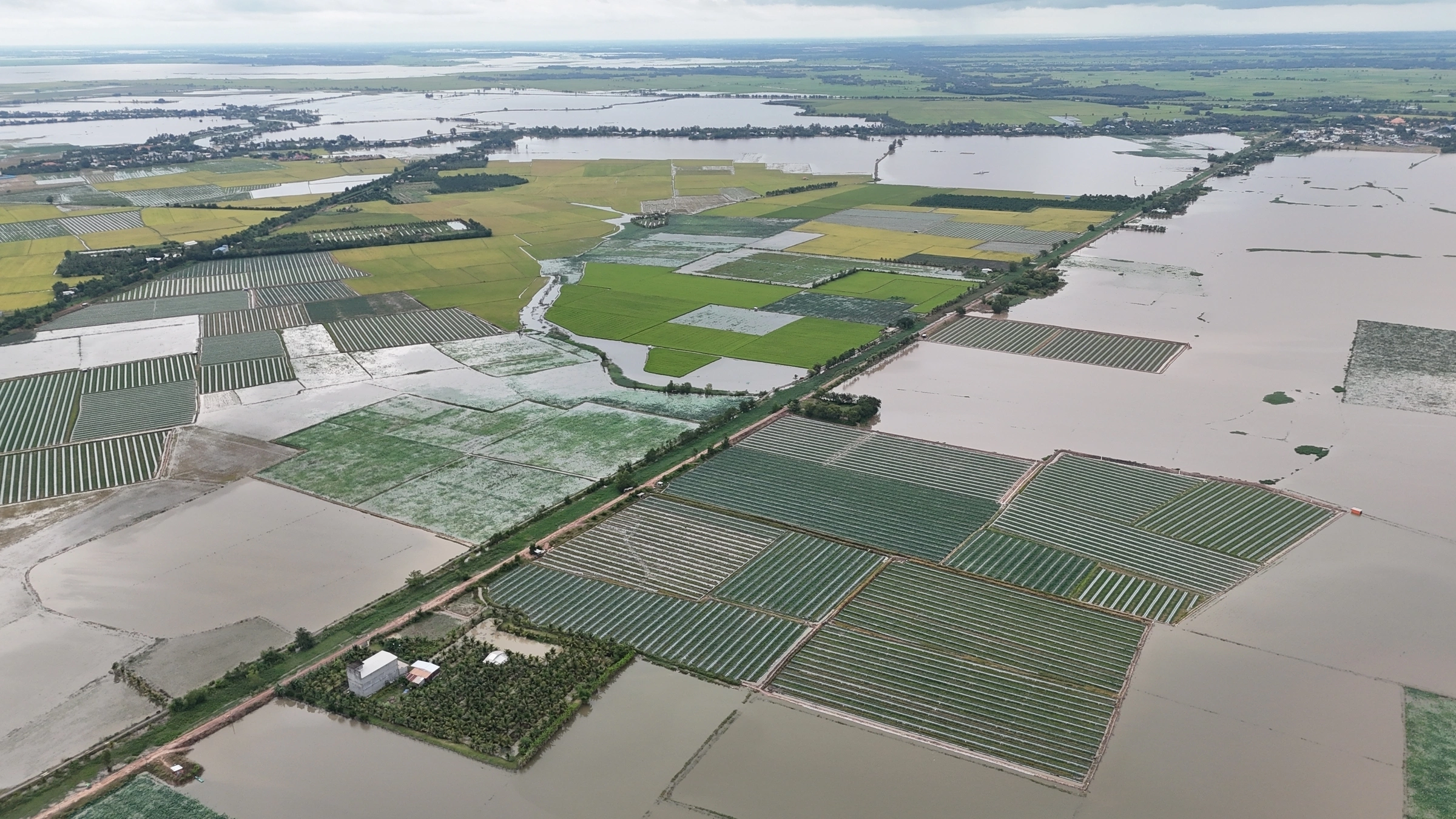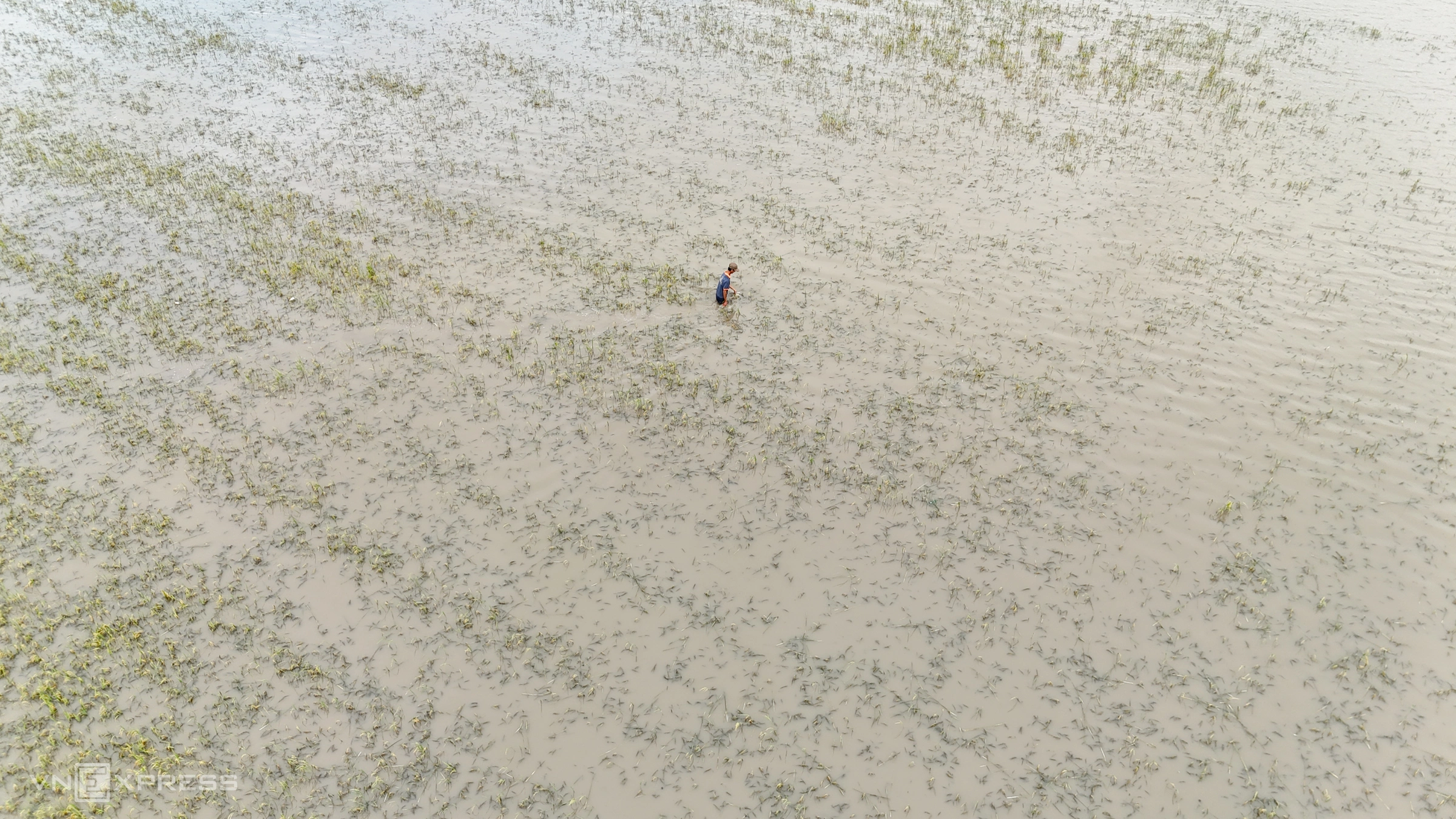 "Trắng tay rồi bà ơi", ông Rẫy nghẹn giọng nói với vợ, khi ngồi thất thần trên xuồng giữa cánh đồng 6 hecta sắp thu hoạch chìm dưới nước sâu. Từ trên cao, cả đồng lúa hình ô bàn cờ bị lũ bao vây.