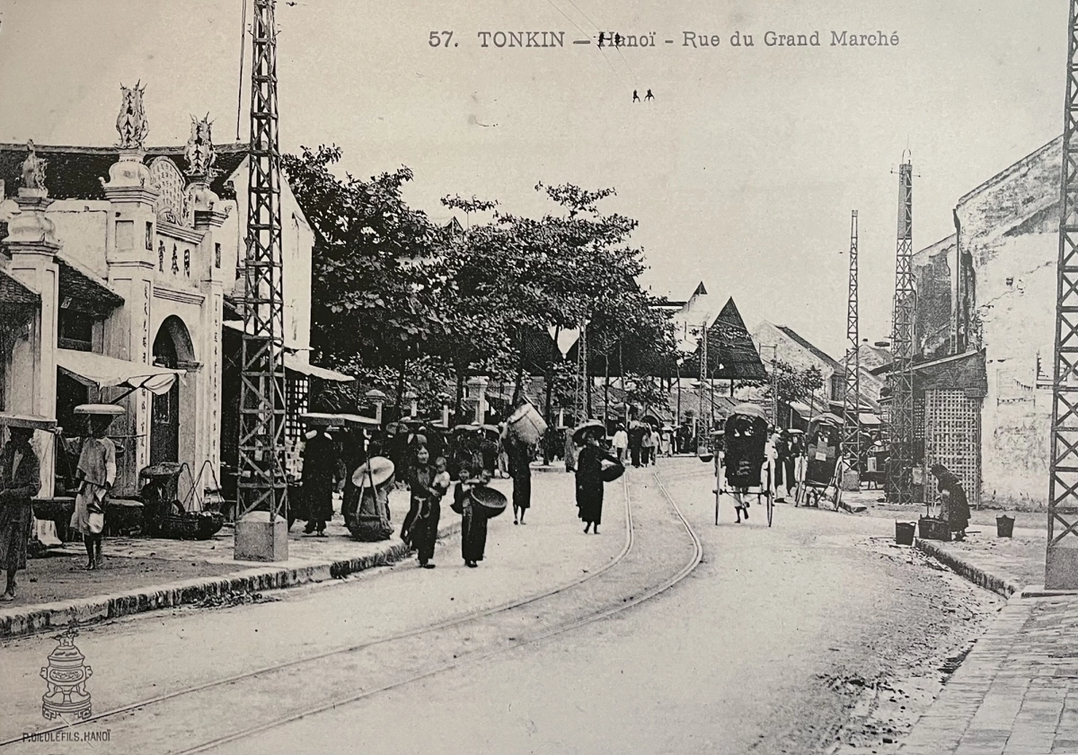 Phía trước chợ Đồng Xuân với bốn dãy nhà, bên ngoài có tuyến xe điện chạy qua đầu thế kỷ 20.