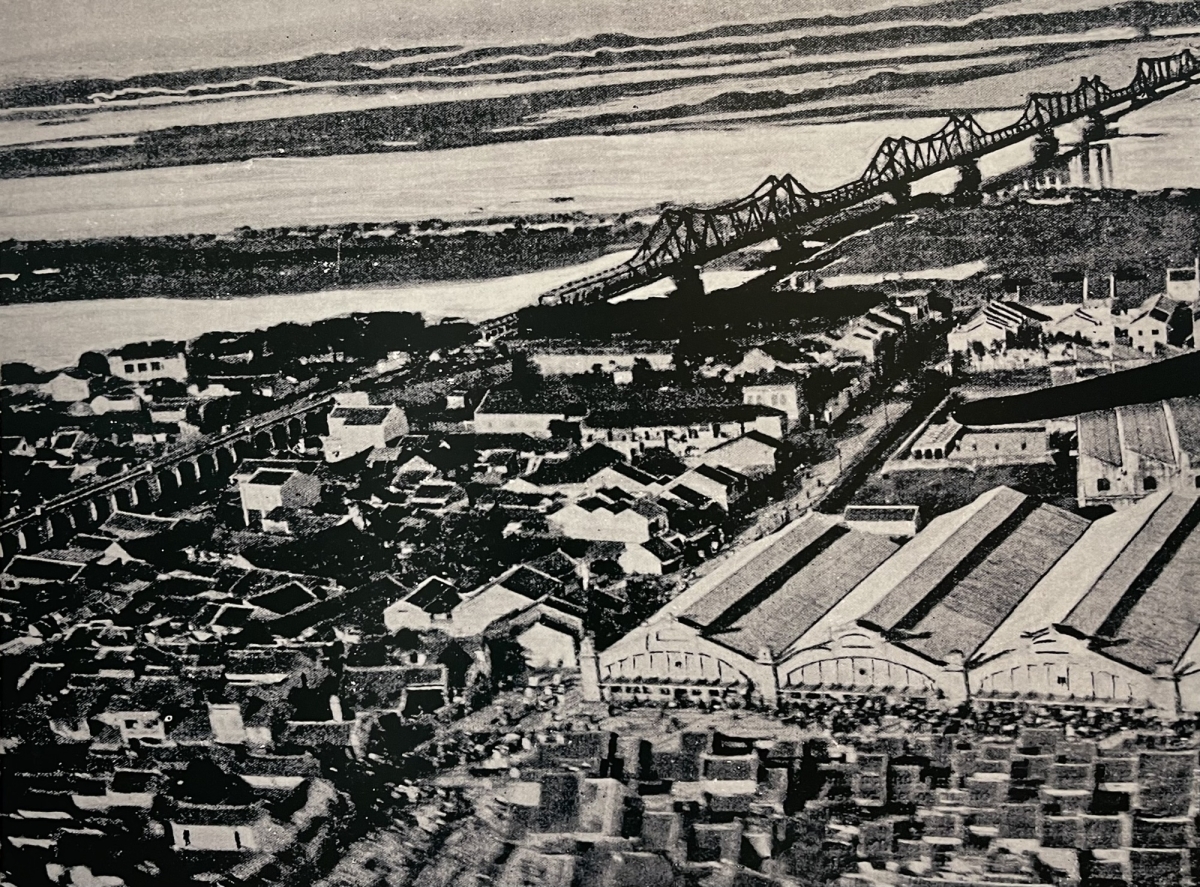 Cầu Doumer giữa thế kỷ 20, lúc này chợ Đồng Xuân đã hoàn chỉnh với năm dãy.