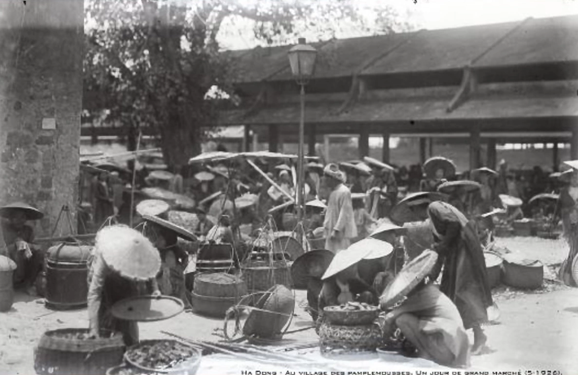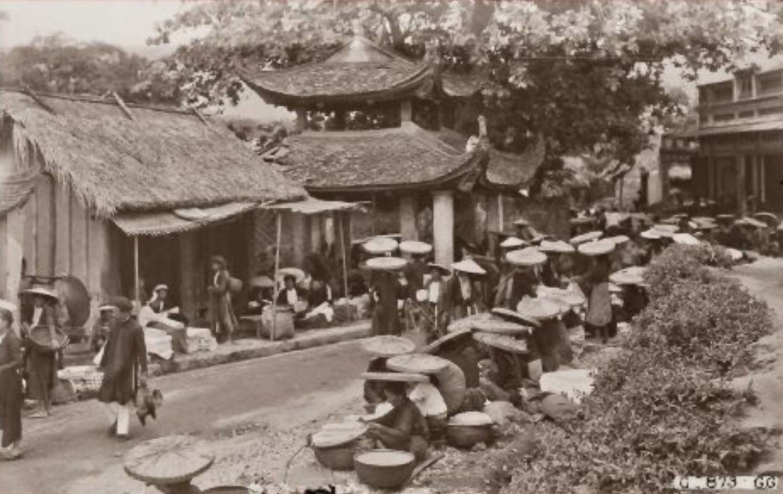 Chợ Bưởi trong một ngày họp phiên năm 1926. Chợ thuộc làng Yên Thái, mỗi tháng sẽ họp sáu phiên vào các ngày 4, 9. Ảnh: Trung tâm Lưu trữ Quốc gia I sưu tầm