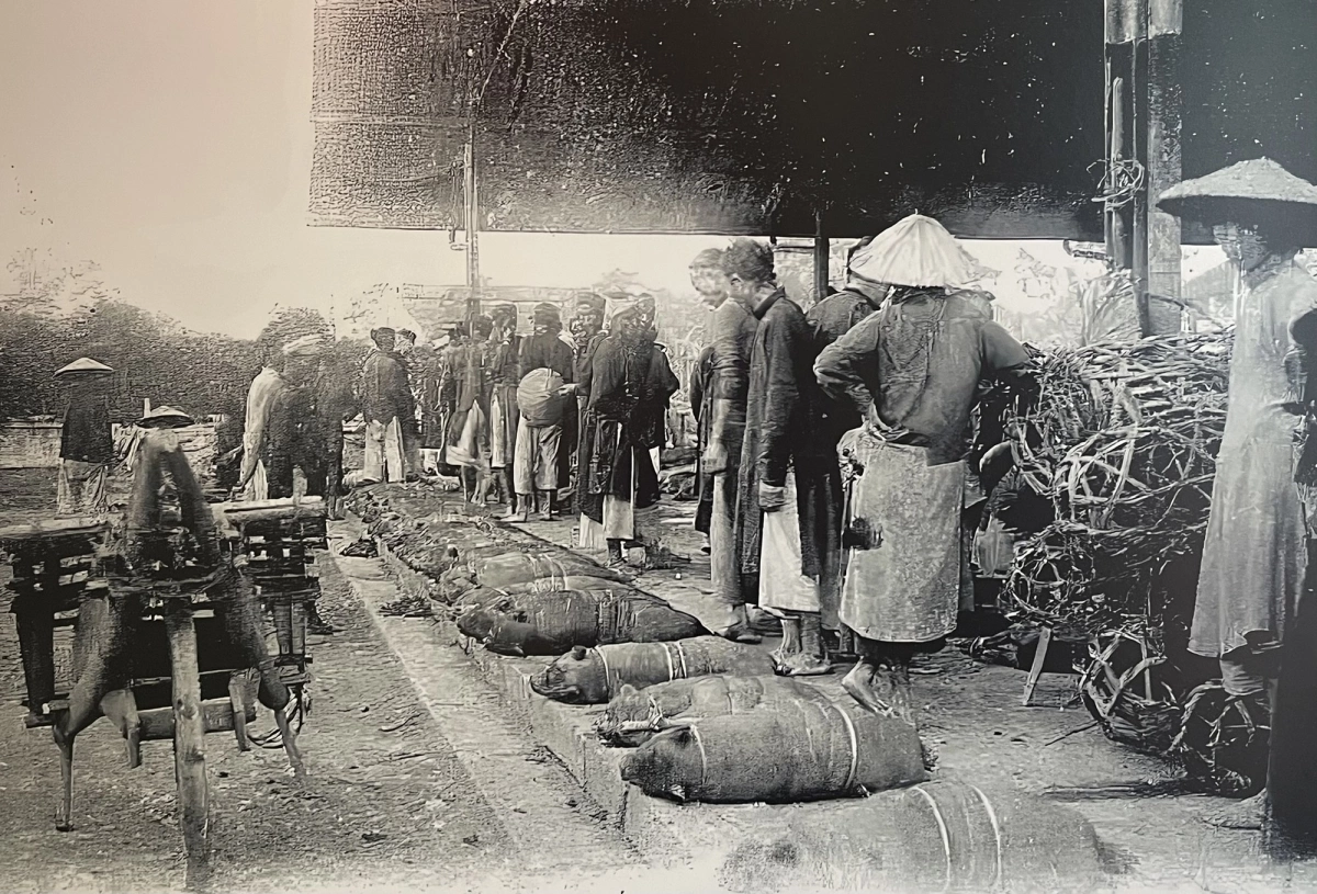 Hình ảnh chợ Lợn ở phố Đường Thành đầu thế kỷ 20 được giới thiệu trong ấn phẩm về quá trình phát triển của chợ Đồng Xuân, ra mắt hôm 8/10. Ảnh: Sách ''Chợ Đồng Xuân - Không gian ký ức''