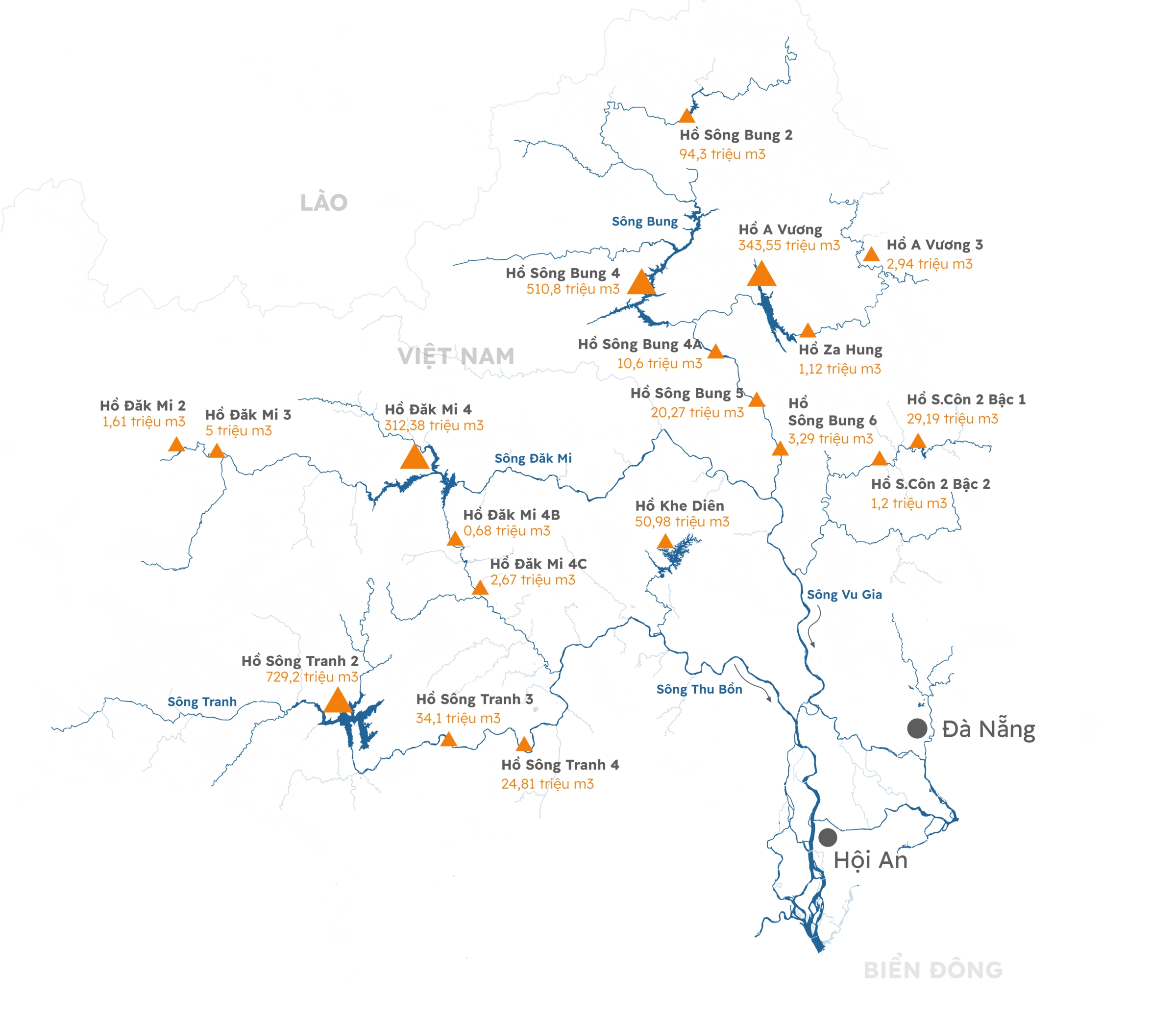 Sông Vu Gia - Thu Bồn là một trong những lưu vực có hệ thống hồ chứa thủy điện phức tạp và dày đặc nhất Việt Nam. Quy mô nhất là A Vương, Đắk Mi 4, Sông Tranh 2, Sông Bung 4...