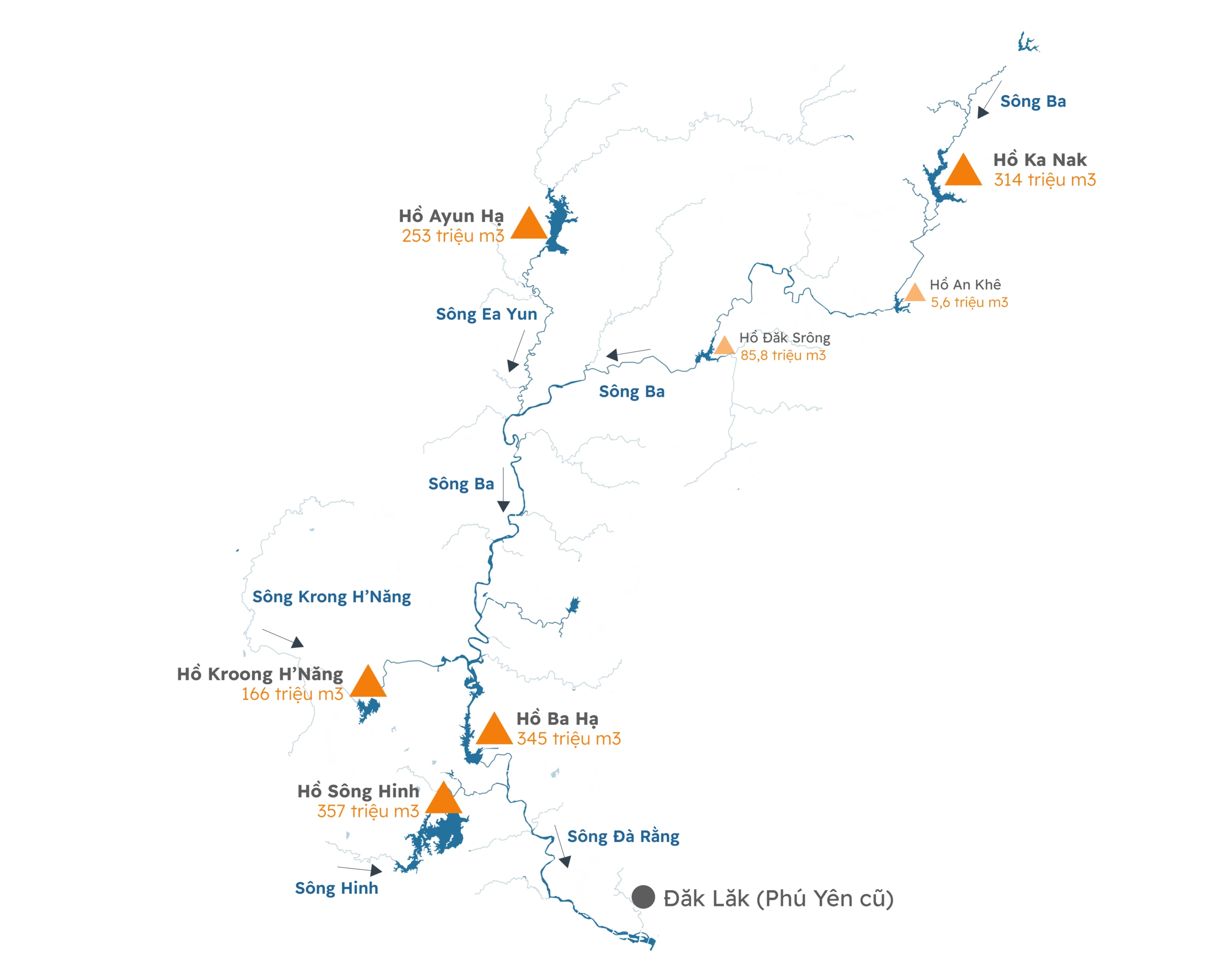 Lưu vực sông Ba - đi qua Gia Lai và Đăk Lăk - có 5 hồ lớn để phòng lũ gồm: Ba Hạ, sông Hinh, Krông H Năng, Kanak, AYun Hạ. Hàng năm lũ xảy ra từ tháng 9 đến 12, với đỉnh lũ vượt báo động 3 từ 1-2 m, gây ngập diện rộng ở vùng hạ lưu. Nguyên nhân là do địa hình kéo dài từ Tây Nguyên xuống biển, độ dốc lớn, thượng lưu hẹp, hạ lưu thấp trũng, dòng chảy tập trung nhanh.