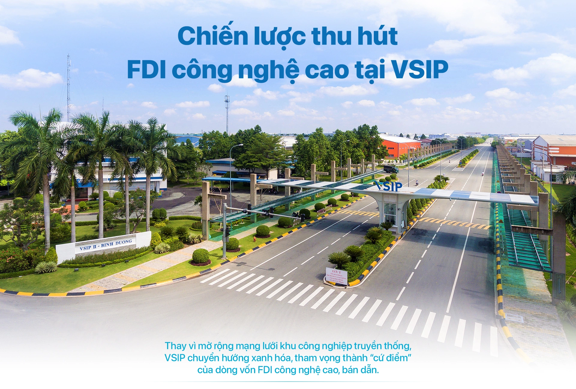 Song song đó, chúng tôi tập trung mạnh vào hạ tầng xanh: sử dụng năng lượng tái tạo, đẩy nhanh quá trình xanh hóa, tăng diện tích cây xanh, tái sử dụng nước thải và phát triển các đơn vị trực thuộc chuyên hỗ trợ nhà đầu tư về năng lượng, môi trường và vận hành bền vững như giải pháp năng lượng mặt trời VSSES hay công ty điện BVP. Qua các đợt tiếp thị toàn cầu tại châu Âu và châu Á, nhiều tổ chức tư vấn lớn đánh giá mô hình khu công nghiệp VSIP đang triển khai sát với nhu cầu thực tế của thị trường hiện nay.