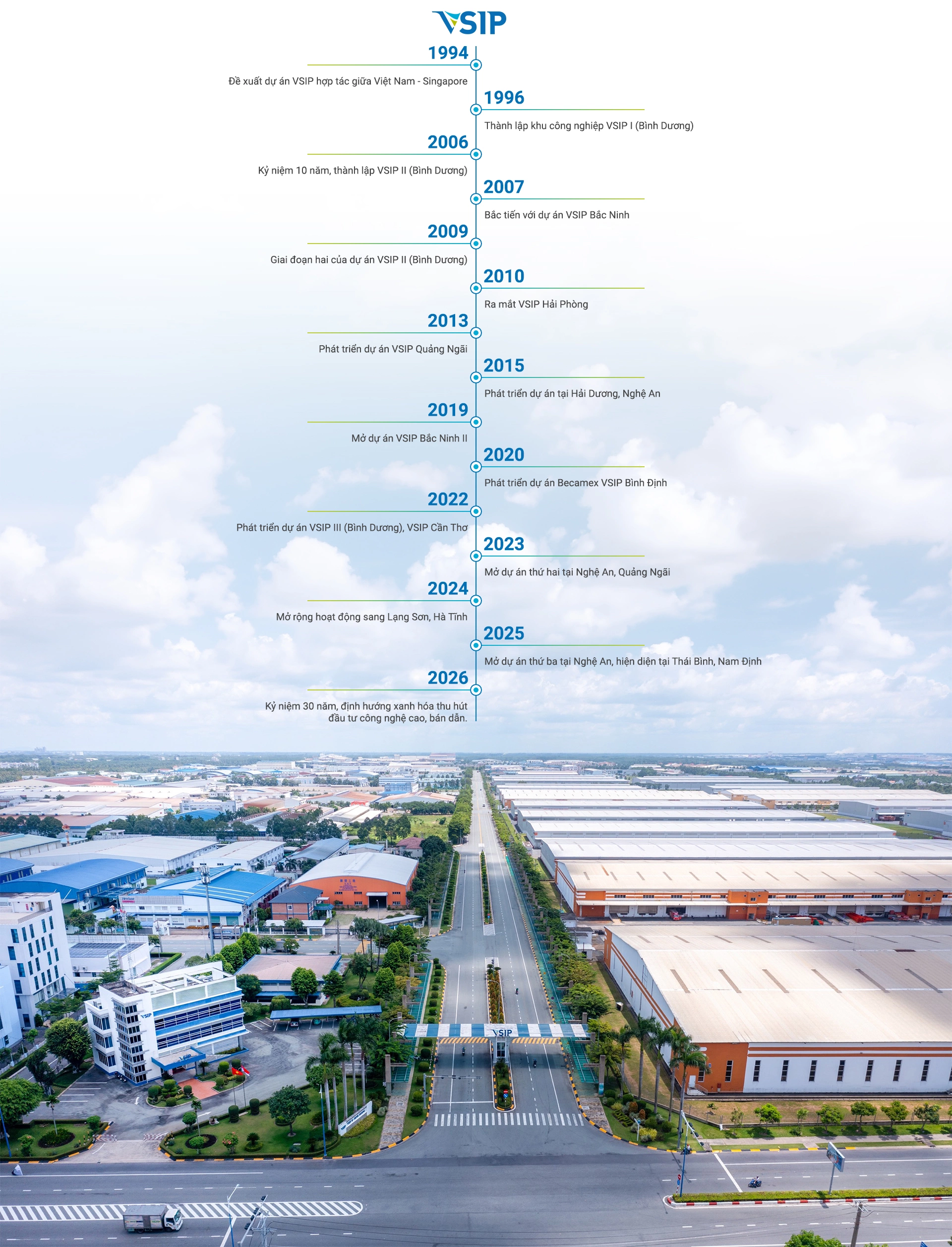 VSIP (Công ty Liên doanh khu công nghiệp Việt Nam - Singapore) hiện diện từ năm 1996 theo hợp tác giữa hai quốc gia. Năm 2026 đánh dấu tròn 30 năm đơn vị hoạt động tại Việt Nam với hơn 22 khu công nghiệp tại 15 tỉnh thành. Mô hình khu công nghiệp của VSIP đóng góp quan trọng cho Việt Nam trong thời kì đẩy mạnh công nghiệp hóa - hiện đại hóa.