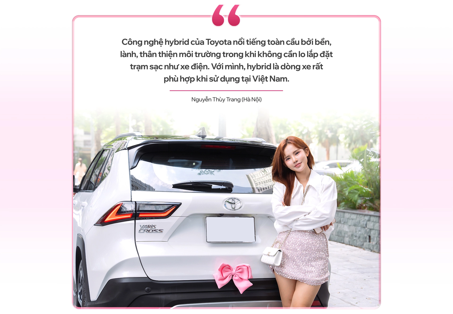 "Chiếc sedan tốn xăng không phải vấn đề quá lớn, nhưng gần 2 năm sử dụng mình vẫn chưa quen xe bởi kích thước dài, thường xuyên bị trầy xước. Đến khi có thông tin Yaris Cross sẽ bán ra tại Việt Nam, mình và chồng đã đến đại lý để tìm hiểu", Thùy Trang, chủ nhân chiếc Yaris Cross HEV cho biết. "Mình theo đuổi lĩnh vực nghệ thuật nên rất nhạy cảm với cái đẹp, đây là lý do mình chọn chiếc sedan VinFast và cả Yaris Cross".