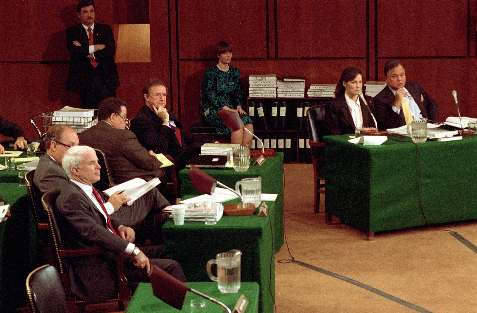 McCain (ngoài cùng bên trái) tham dự một phiên điều trần của Ủy ban Đạo đức Thượng viện Mỹ năm 1990. Ông bị điều tra với cáo buộc là một trong 5 thượng nghị sĩ giúp nhà tài phiệt Charles Keating, người từng quyên góp cho quỹ vận động chính trị của 5 nghị sĩ này, tránh những quy định về tài chính, dẫn tới "cuộc khủng hoảng tín dụng" thời kỳ đó. Cả 5 người đều không bị truy tố song McCain bị Ủy ban Đạo đức Thượng viện khiển trách vì có "phán xét sai lầm".