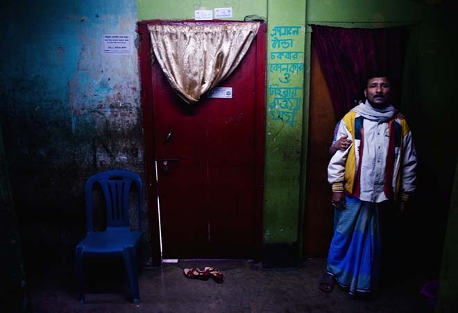 Gái mại dâm đứng tập trung lấy nước trong một nhà thổ. Thu nhập từ công việc "đi khách" không nhiều, chỉ vừa đủ để họ mua đồ ăn và sống trong những ngôi nhà tồi tàn.