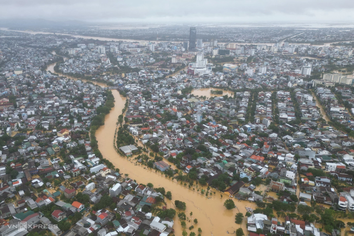 Các tuyến đường dẫn vào phường An Cựu biến thành sông, nhiều nơi ngập sâu 2 m. Ngoài thuyền, chỉ có xe của quân đội, công an mới tiếp cận được nơi này.