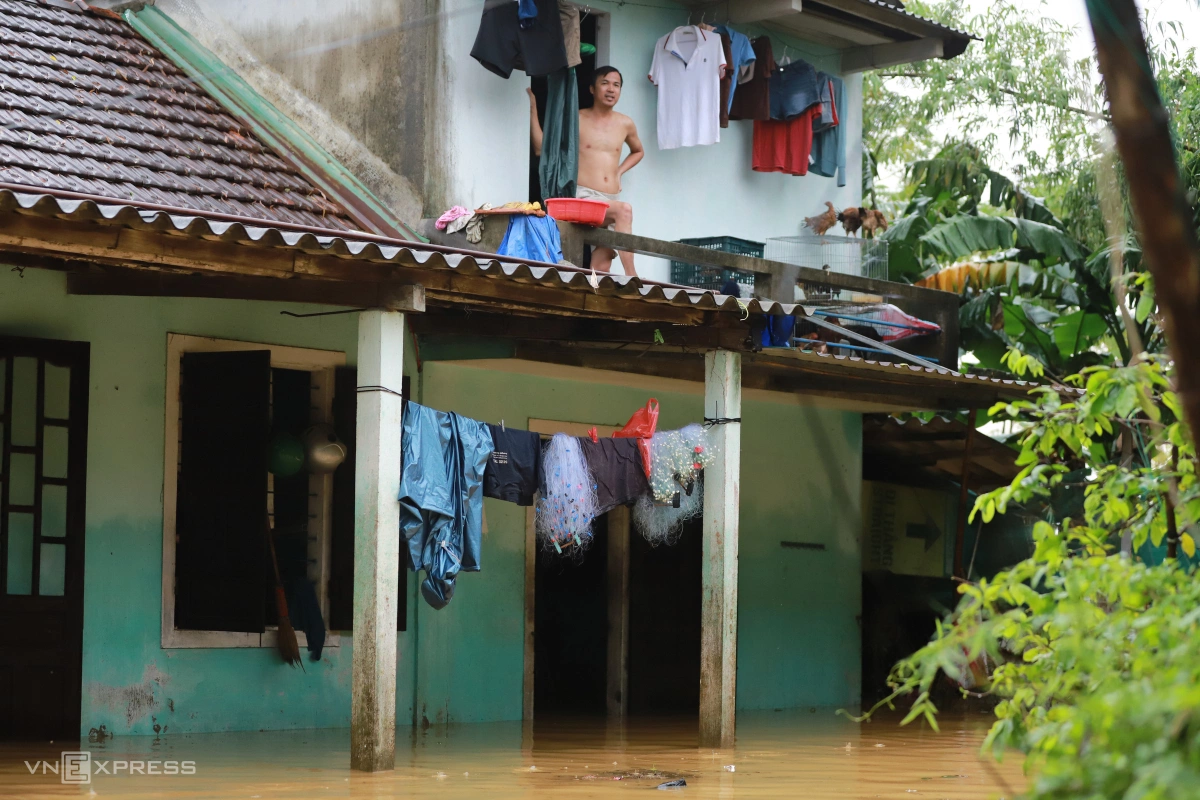 Xe máy được người dân treo lên cao tránh lũ. So với lúc đỉnh ngày 27/10, nước đã rút khoảng một mét, nhưng nhiều người vẫn lo lũ lên lại.