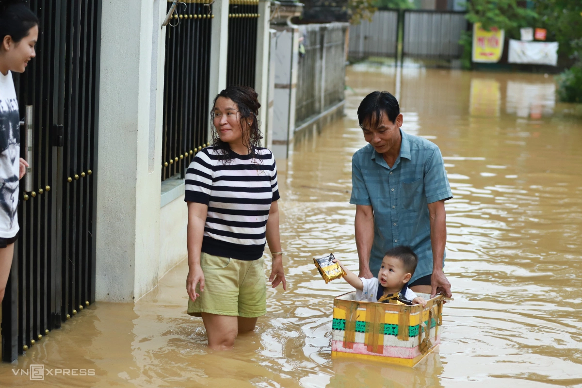 Dưới trời mưa lớn, người dân An Cựu vẫn lội nước đến chợ, siêu thị mua đồ hoặc tới UBND phường nhận thực phẩm tiếp tế. Họ mang theo thùng xốp để đựng, cũng là phao cứu sinh khi cần thiết.