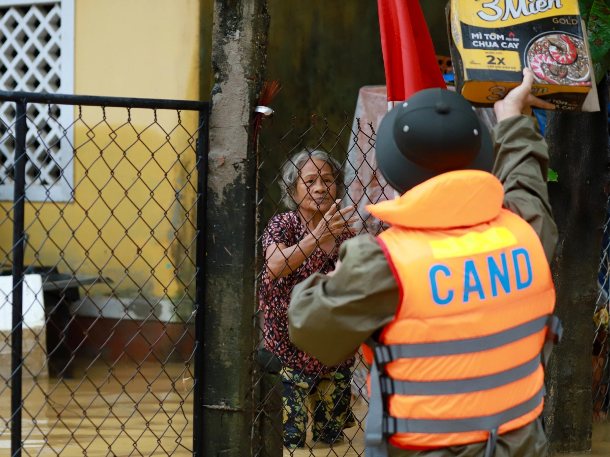 Công an, dân quân tự vệ phường An Cựu dùng canô đưa đồ cứu trợ đến người dân. Trên đường đi, công an thổi còi hoặc gọi báo cho bà con biết.