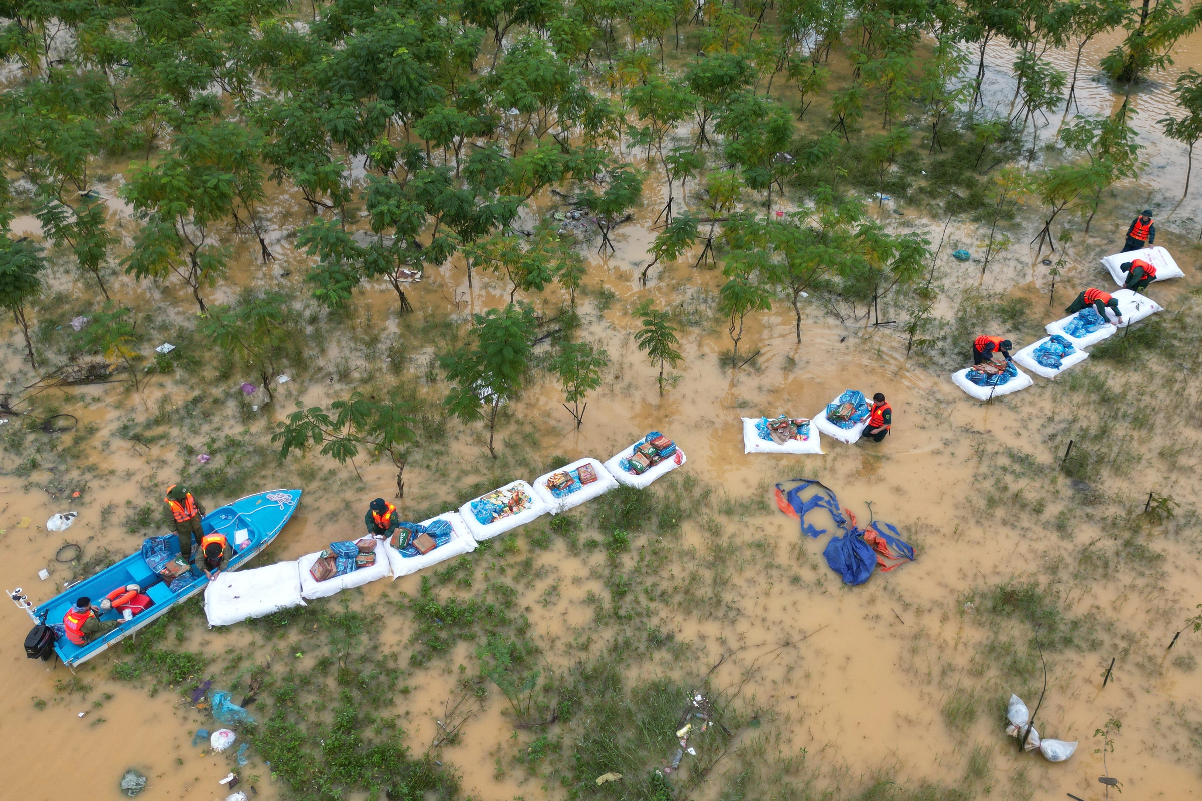 Người đàn ông cho cháu vào thùng xốp đẩy đi nhận hàng cứu trợ. Sau khi nhận mì tôm của lực lượng cứu hộ, em bé khoe với hàng xóm.