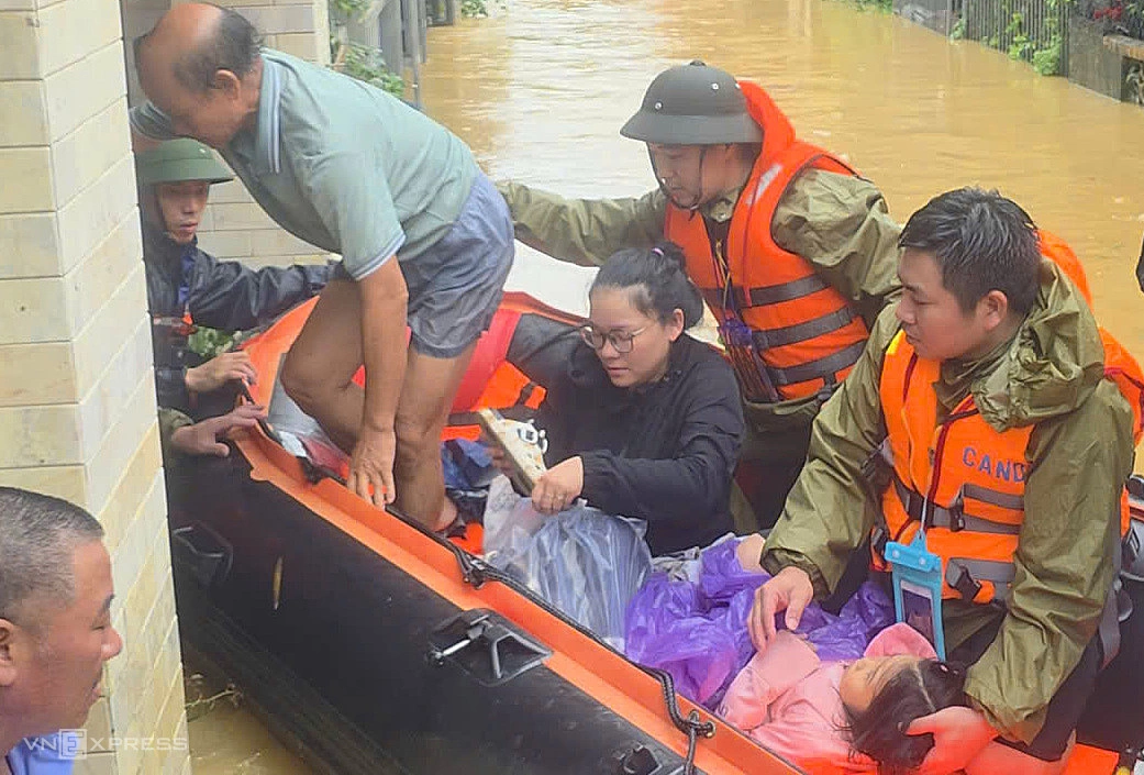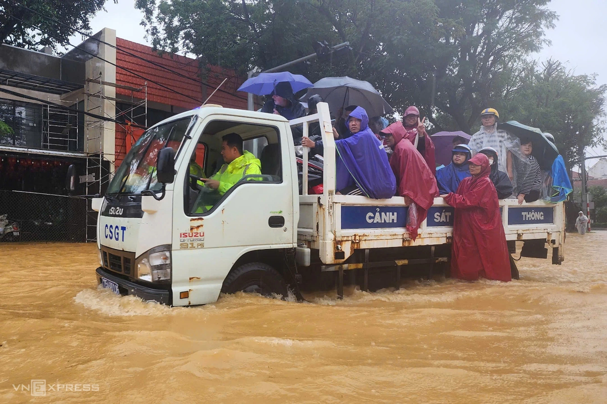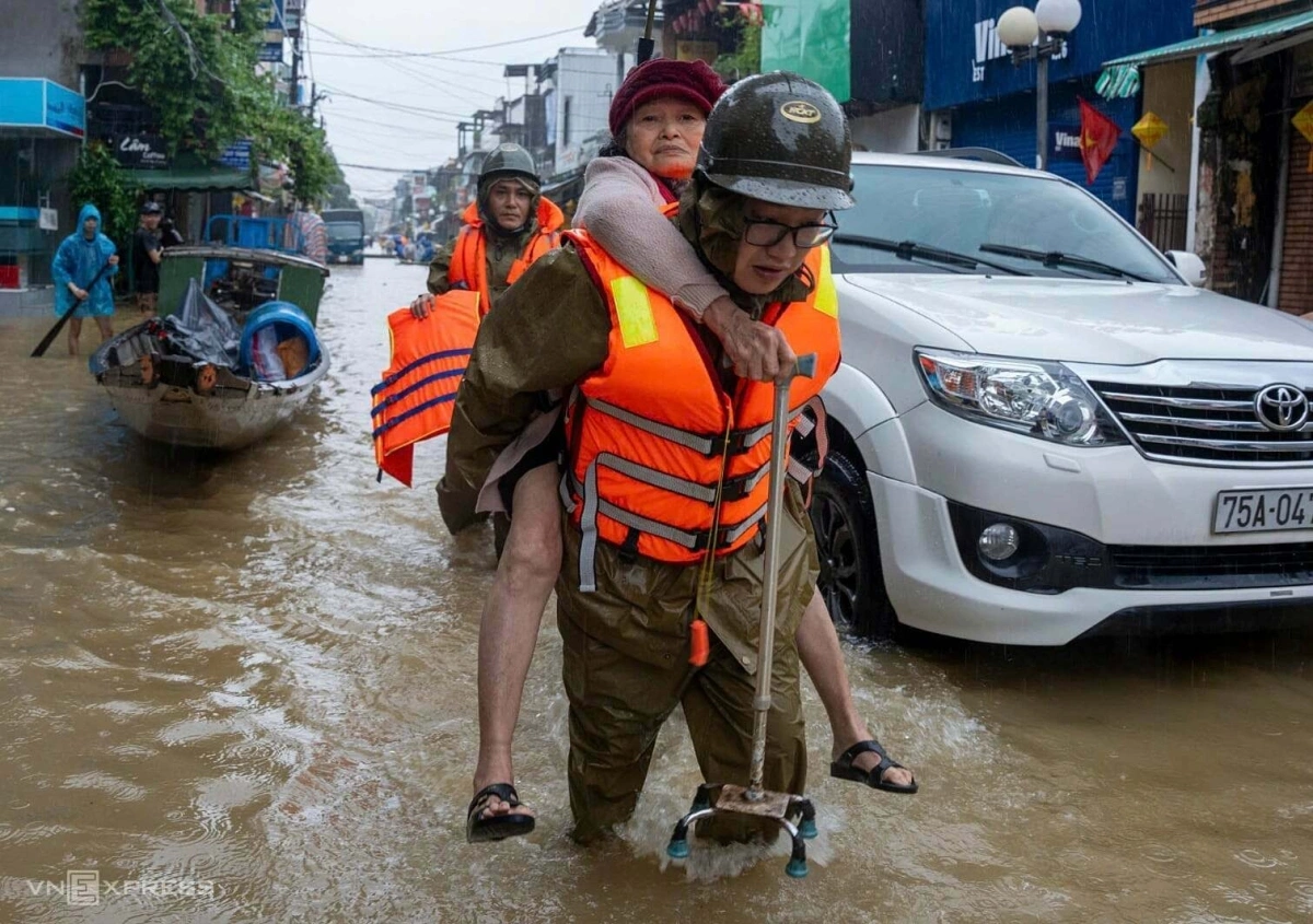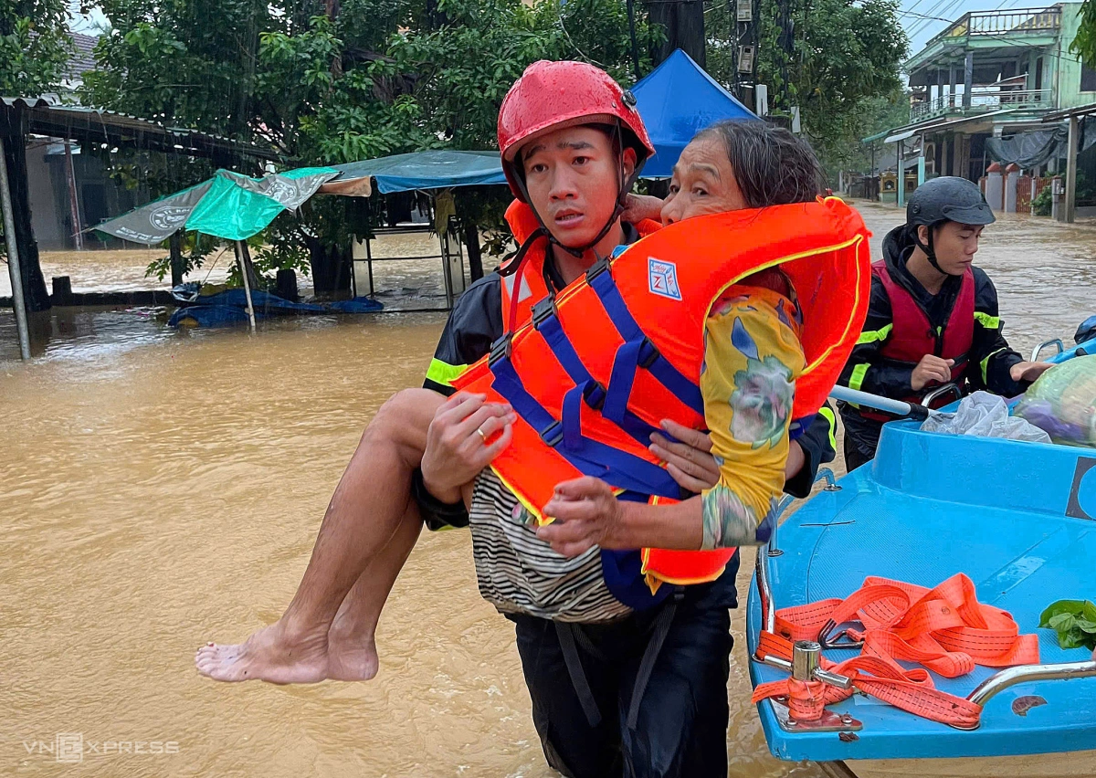 Nhiều nhà dân ở phường Phú Xuân, trong kinh thành Huế, bị ngập 1-2 m. Hai ngày qua, công an phường túc trực 100% quân số, hỗ trợ người dân di chuyển khỏi vùng ngập. Người già được đưa đến khu vực cao ráo.